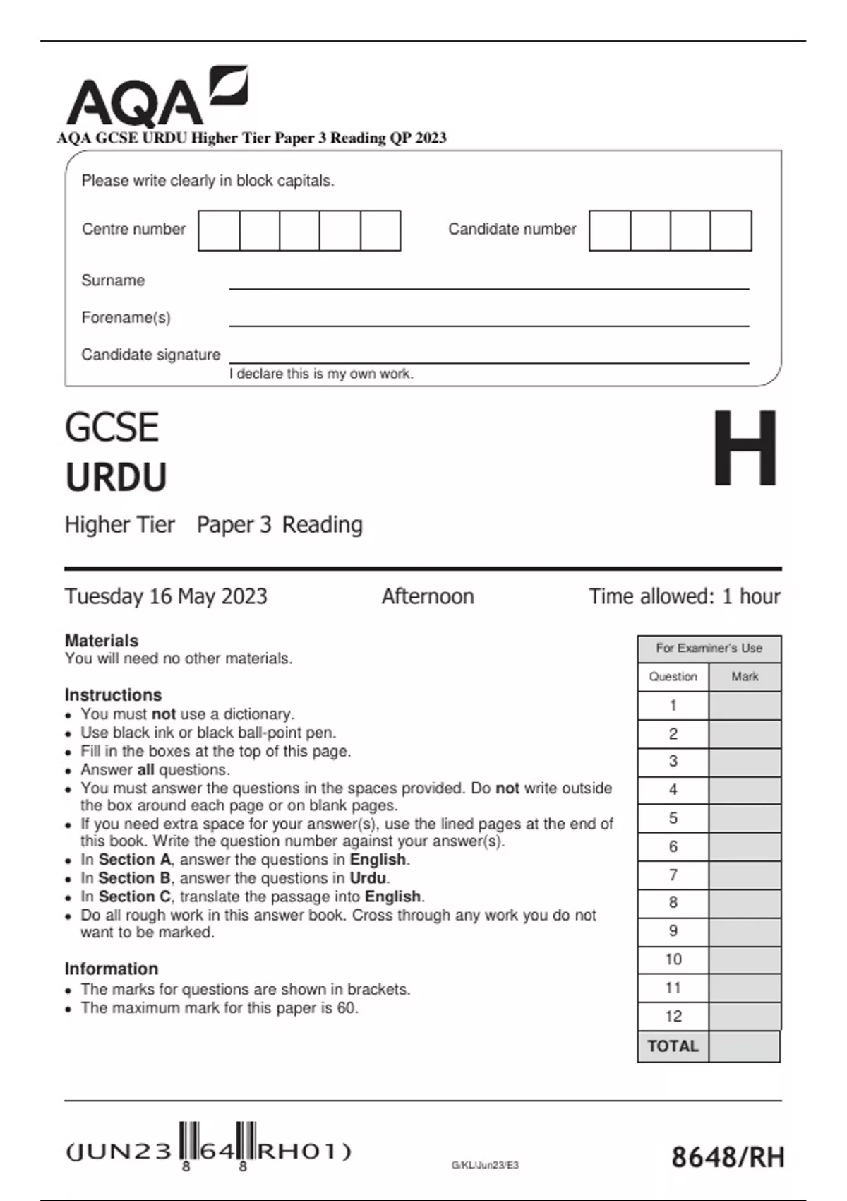 AQA GCSE URDU Higher Tier Paper 3 Reading QP 2023