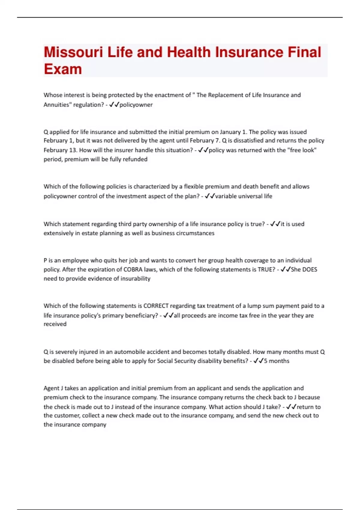 Missouri Life and Health Insurance Final Exam Questions and Answers with complete solution