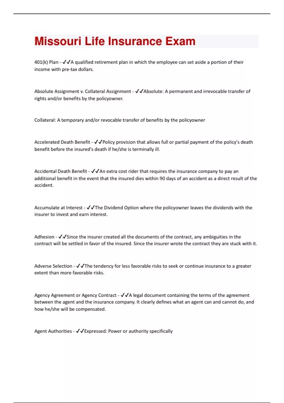 Missouri Life Insurance Exam Exam Questions and Answers Best rated A+ Guaranteed Success Latest Update
