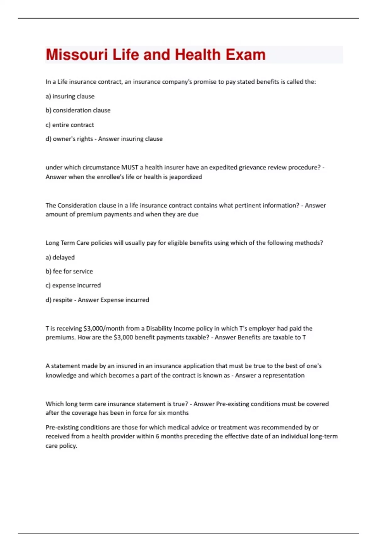 In a Life insurance contract, an insurance company's promise to pay stated benefits is called the: a) insuring clause b) consideration clause c) entire contract d) owner's rights - Answer insuring clause under which circumstance MUST a health insurer have an expedited grievance review procedure? - Answer when the enrollee's life or health is jeapordized The Consideration clause in a life insurance contract contains what pertinent information? - Answer amount of premium payments and when they are due Long Term Care policies will usually pay for eligible benefits using which of the following methods? a) delayed b) fee for service c) expense incurred d) respite - Answer Expense incurred T is receiving $3,000/month from a Disability Income policy in which T's employer had paid the premiums. How are the $3,000 benefit payments taxable? - Answer Benefits are taxable to T A statement made by an insured in an insurance application that must be true to the best of one's knowledge and which becomes a part of the contract is known as - Answer a representation Which long term care insurance statement is true? - Answer Pre-existing conditions must be covered after the coverage has been in force for six months Pre-existing conditions are those for which medical advice or treatment was recommended by or received from a health provider within 6 months preceding the effective date of an individual long-term care of the following is NOT allowed in regards to the Medigap (Medicare Supplement) policy? - Answer Issuing an additional Medigap policy to ensure no out-of-pocket exposure for the insured Jasmine is a salaried employee of an insurance company. Which of the following duties would require her to be licensed as an insurance producer? a) adjusting claims b) underwriting insurance applications c) administrative assistant to the VP of Sales d) soliciting insurance policies - Answer Soliciting insurance policies