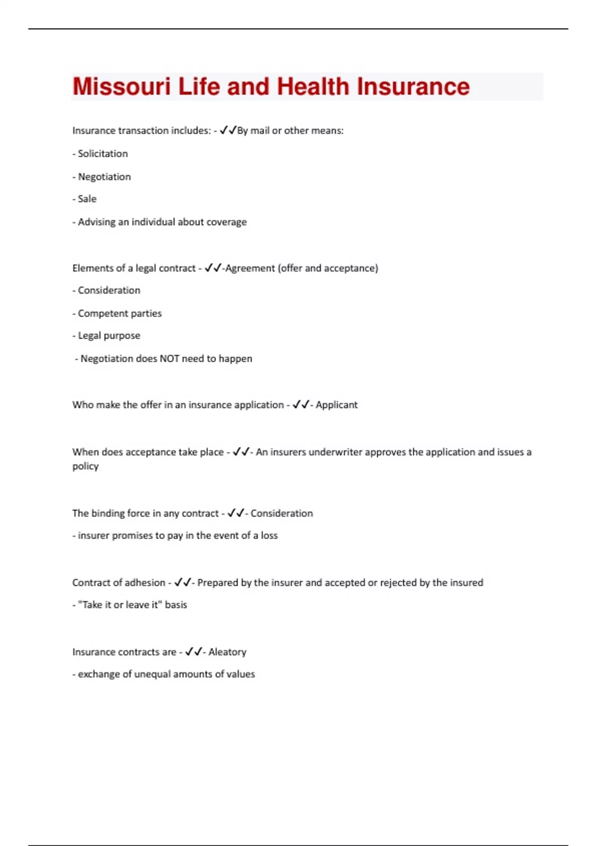 Insurance transaction includes: - By mail or other means: - Solicitation - Negotiation - Sale - Advising an individual about coverage Elements of a legal contract - -Agreement (offer and acceptance) - Consideration - Competent parties - Legal purpose - Negotiation does NOT need to happen Who make the offer in an insurance application - - Applicant When does acceptance take place - - An insurers underwriter approves the application and issues a policy The binding force in any contract - - Consideration - insurer promises to pay in the event of a loss Contract of adhesion - - Prepared by the insurer and accepted or rejected by the insured - "Take it or leave it" basis Insurance contracts are - - Aleatory - exchange of unequal amounts of valuesUnilateral contract - - only one of the parties is legally bound - "one-way contract" "When does an insurance policy go into effect" - - When the insured receives it Conditional contract - - certain conditions must be met by the policy owner Warranty - - An absolutely true statement upon upon which the validity of the insurance policy depends Representions - - Statements believed to be true Misrepresentation - - Untrue statements on the applications - Can void the contract Material misrepresentation - - Would alter the underwriting decision of insurance company Part 1- General Information - - Name, age, address, birth date, gender, income, marital status, and occupation Part 2- Medical Information - - Medical background, present health - Medical visits in recent years - Medical status of relatives/ causes of deaths Field underwriter - - Solicited the potential insured - Analyzes health - Gets info on client Agents report - - Observations concerning the proposed insured- Does not become a part of the entire contract - communicate with underwriter and provide info about the applicant known by the agent Required signatures - - the proposed insured - the agent - the policy owner (if not proposed insured) Changes in the application - - Applicant must initial the change