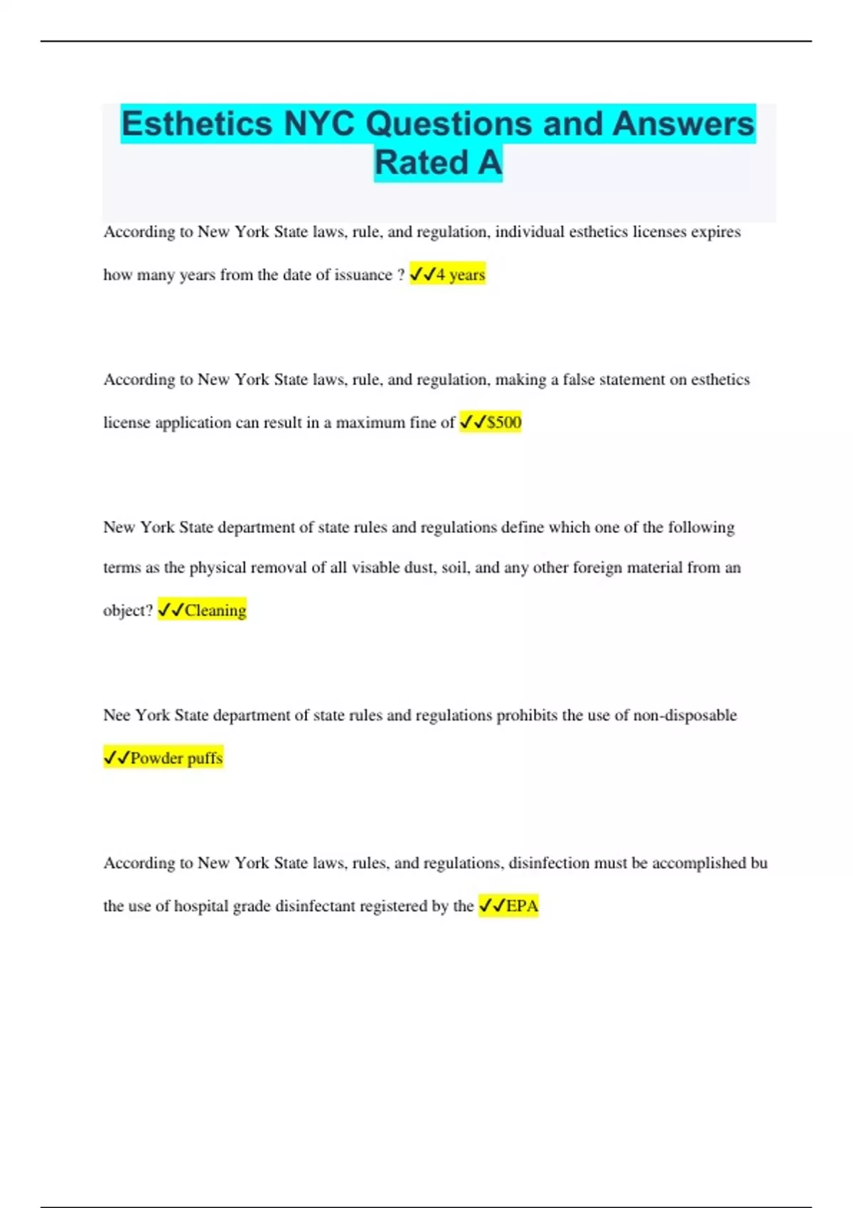 Esthetics NYC Questions and Answers Rated A According to New York State laws, rule, and regulation, individual esthetics licenses expires how many years from the date of issuance ? 4 years According to New York State laws, rule, and regulation, making a false statement on esthetics license application can result in a maximum fine of $500 New York State department of state rules and regulations define which one of the following terms as the physical removal of all visable dust, soil, and any other foreign material from an object? Cleaning Nee York State department of state rules and regulations prohibits the use of non-disposable Powder puffs According to New York State laws, rules, and regulations, disinfection must be accomplished bu the use of hospital grade disinfectant registered by the EPA Which one of the following is the name of the detailed information bulletin prepared by the manufacture or importer of a chemical that describes the chemical properties. Physical and healrh hazards, roots of exposure, precautions for safe handing and use emergency and first aid procedures and control measure ? MSDS Any substance that can cause acute or chronic illness to the human body, can be classified as Toxic Substances whose agents are capable of altering the genetic patterns of a living cell are Mutagens Any liquid having a flashpoint below 100 degrees Fahrenheit is considered Flammable According to state law rules and regulations temporary esthetics licenses expire after the period of time issuance is 6 months Cotton pads that have come in contact with blood or discharge from pimples must be disposed of in a Plastic bag Which one of the following terms is the process that kills all disease producing organisms including bacteria, fungi, viruses, and spores ? Sterilization All supplies and implements must be transported to and from remote location in containers that are Covered The federal government requires material data sheets be prepared and made available to workers by the Product manufacturer Chemicals that cause permanent visible destruction or change in living tissue at the sight of contact are known as Corrosives The sum of adverse effects from exposure to a substance is known as Toxicity Adverse health defects that develop slowly over a long period of time and persist or re occur frequently are called Chronic According to New York law rules and regulations when an esthetician fail to properly file for renewal within 5 years of licenses expiration, a new license cannot be issued until Passes a written examination According to New York State laws rules and regulations the photograph affixed to the esthetics license must be no more than how many years old ? 4 years old New York State department of state rules and regulations prohibit the use of non disposable Sponges New York department of state rules and regulation define which of the following terms as the process of making an object clean and safe for use ? Sanitation According to New York State rules and regulations disinfection must be accomplished by the use of the hospital grade disinfectant registered by the EPA According to NY state regulations and laws an esthetician who fails to properly file a renewal must pay an additional fee of $10 According to NY state regulations and law the total number of temporary licenses that an esthetician can obtain is 2 According to NY state regulations and law rules and regulations the absence of which of the following in an appearance enhancement workplace is evidence of an act non- compliance ? Plastic bags According to NY state regulations and laws which word properly defines that the process which kills most disease producing organism ? Disinfection According to NY state regulations and law define which one of the following terms as the process that renders an object safe for internal skin penetration ? Sterilization A salon employee who wished to obtain hazard information about a new product for use at work should contact the Manufacture or distributor of products Non corrosive chemicals that temporarily inflame living tissues by chemical action at the site of contact is known as Irritants Substances or agents capable of producing or causing cancer are known as Carcinogens Adverse health affects with symptoms that develop rapidly are called Acute During the infection control process the level of decontamination that completely destroys all of an organism Sterilization Washing your hand with soap and water is an example of what level of decontamination ? Sanitation Which one of the following type of disinfectants is generally odorless, colorless, non toxic and stable ? Quaternary ammonium compound Which one of the following types of disinfectants is not recommended for salon use because of its active ingredients that are poisonous to inhale ? Formalin Rubbing alcohol is the common name for what type of alcohol ? Isopropyl The use of which one of the following is the most preferred in a disinfection process for salon implements ? Autoclave During the infection control process the highest level of decontamination is Sterilization Hospital grade disinfectants generally do not kill Spores To achieve disinfection, salon implements should generally be soaked in quat solution for at lease 10-15 min Another name for household bleach is Sodium hypochlorite The minimum strength of isopropyl alcohol necessary for disinfection is 70 % In order to achieve sterilization an autoclave uses air pressure and Steam Which one of the following is the name of the information bulletin prepared by the manufacturer or importer of chemicals that describe the chemicals physical and chemical properties physical and health hazards exposure precautions and emergency info ? MSDS Chemicals that cause a substantial proportion of exposing people to develop an allergic reaction after repeated exposure are known as Sensitizers Substances or chemical capable of causing birth defects are called Teratogens Any solid, liquid, or