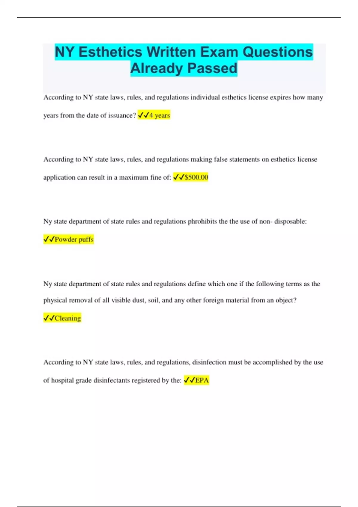 NY Esthetics Written Exam Questions Already Passed