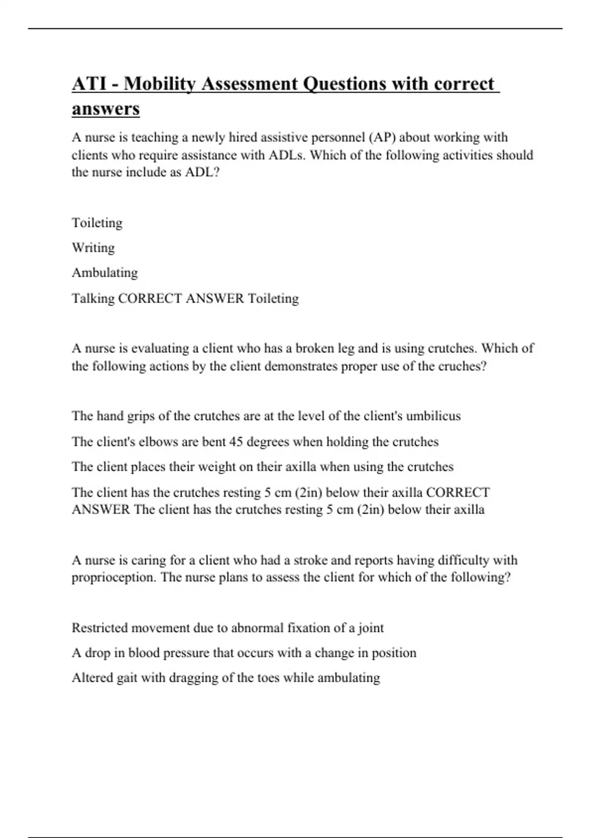 A nurse is teaching a newly hired assistive personnel (AP) about working with clients who require assistance with ADLs. Which of the following activities should the nurse include as ADL? Toileting Writing Ambulating Talking CORRECT ANSWER Toileting A nurse is evaluating a client who has a broken leg and is using crutches. Which of the following actions by the client demonstrates proper use of the cruches? The hand grips of the crutches are at the level of the client's umbilicus The client's elbows are bent 45 degrees when holding the crutches The client places their weight on their axilla when using the crutches The client has the crutches resting 5 cm (2in) below their axilla CORRECT ANSWER The client has the crutches resting 5 cm (2in) below their axilla A nurse is caring for a client who had a stroke and reports having difficulty with proprioception. The nurse plans to assess the client for which of the following? Restricted movement due to abnormal fixation of a joint A drop in blood pressure that occurs with a change in position Altered gait with dragging of the toes whi