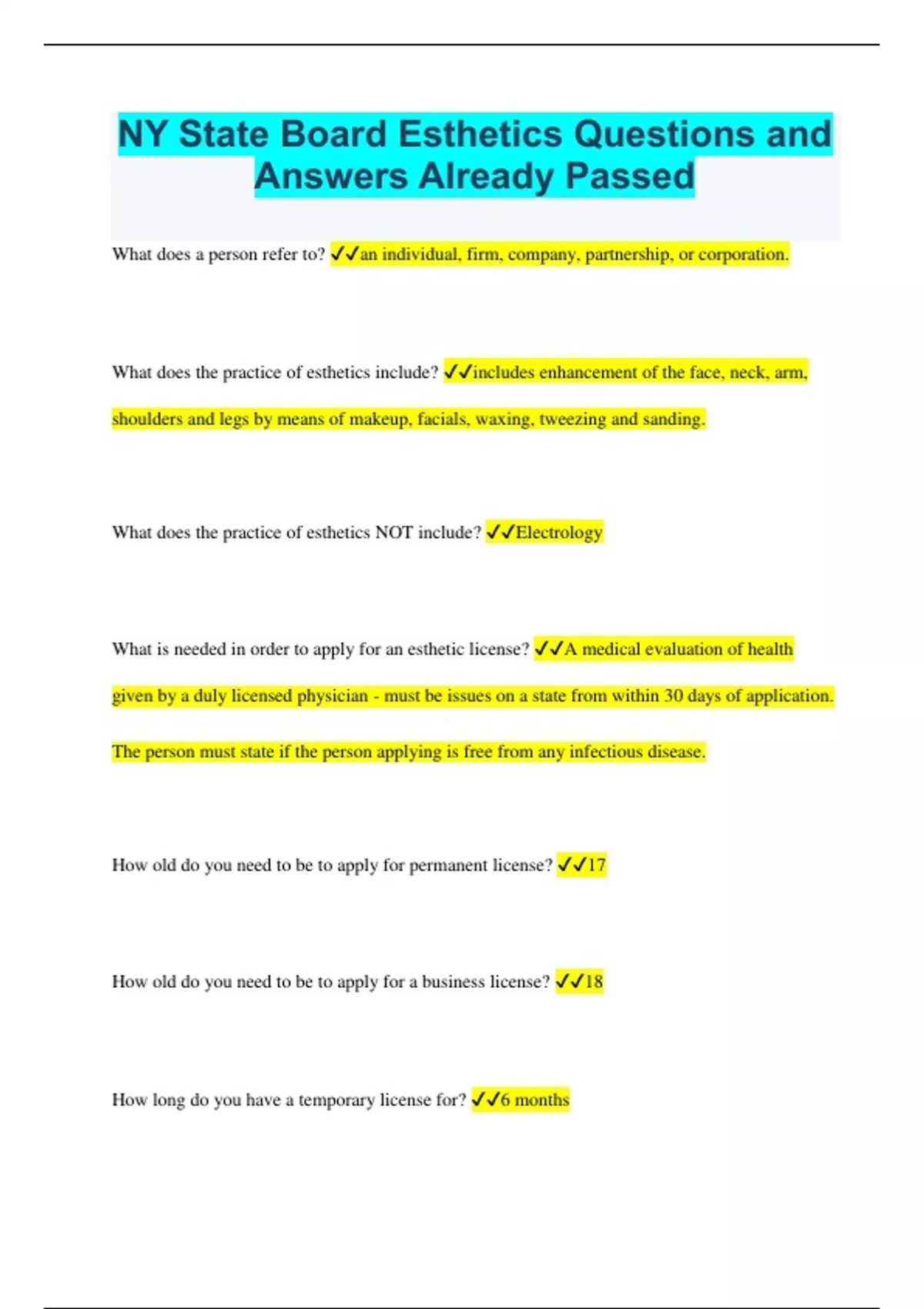 NY State Board Esthetics Questions and Answers Already Passed