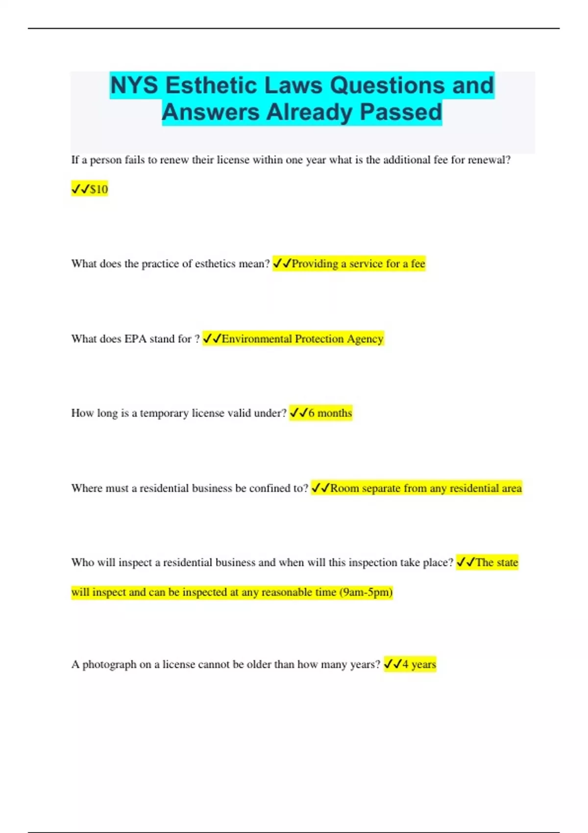NYS Esthetic Laws Questions and Answers Already Passed If a person fails to renew their license within one year what is the additional fee for renewal? $10 What does the practice of esthetics mean? Providing a service for a fee What does EPA stand for ? Environmental Protection Agency How long is a temporary license valid under? 6 months Where must a residential business be confined to? Room separate from any residential area Who will inspect a residential business and when will this inspection take place? The state will inspect and can be inspected at any reasonable time (9am-5pm) A photograph on a license cannot be older than how many years? 4 years How many members must be engaged in the practice of esthetics? 1 How much do member of the advisory committee receive as compensation? No compensation At what age can a person obtain an Appearance Enhancement Business? 18 What does s licensee mean? A person who's licensed to be an esthetics How often do you renew your license? Every 4 years A bona-fide purchaser of a licensed appearance enhancement business may continue to use the license of the seller for a period of how many days? 30 days What do you need to practice legally? An esthetics license How long is an esthetician from another state or country allowed to practice in NY? 3 months or less within any calendar year ? What does Appearance Enhancement Business mean? Means the business of providing any or all of the services licensed pursuant to this article at fixed location First violation $500 Second violation $1,000 Third violation $2,500 When the word Secretary appears in New York laws, what kind of Secretary is it? Secretary of State The application for an Esthetics License shall be subscribed by the applicant and affirmed under what kind of penalty? Perjury ( Cannot lie on application ) At what age can you get an Esthetics license? 17 What does OSHA mean? Occupational Safety and Health Administration Describe disinfection Kills/destroys most disease causing bacteria Describe Sanitation Clean and safe for use Describe sterilization Kills all disease Describe cleaning Physical removal of all dust, soil and debris What is an MSDS and where must it be stored? Material Safety Data Sheet has information on what to do incase of emergency. Should be store in metal accessible to all employees If a person fails to file and application and fee for renewal within five years, what happens? They are eligible for another license until they pass another exam Does a duplicate license have the same number as the original and what is stamped across it? Same number and duplicate stamp What happens if you fail to display your license? License can be suspended or revoked or have a fine not exceeding $500 At what age can a person obtain an Appearance Enhancement Business License? 18 An application for an Appearance Enhancement Business License shall be accompanied by what? Bond or liability insurance Implements that are intended to penetrate the skin shall be...? Single use or subject to sterilization Where must used towels and used linens be placed In a covered receptacle How many times does the state provide examinations per year? 4 at convenient places within the state What must and owner, area renter or both be responsible for ? Everything How many years experience shall a New York Stare licenses practical examiner have? 5 or more Fee for changing the address on a license $10 Fee for a duplicate license $10 Fee to take your written exam $15 The fee for an application for license $40 Fee for changing a name on an appearance Enhancement Business License $30 Fee for temporary license $10 Fee for an Appearance Enhancement Business License $60