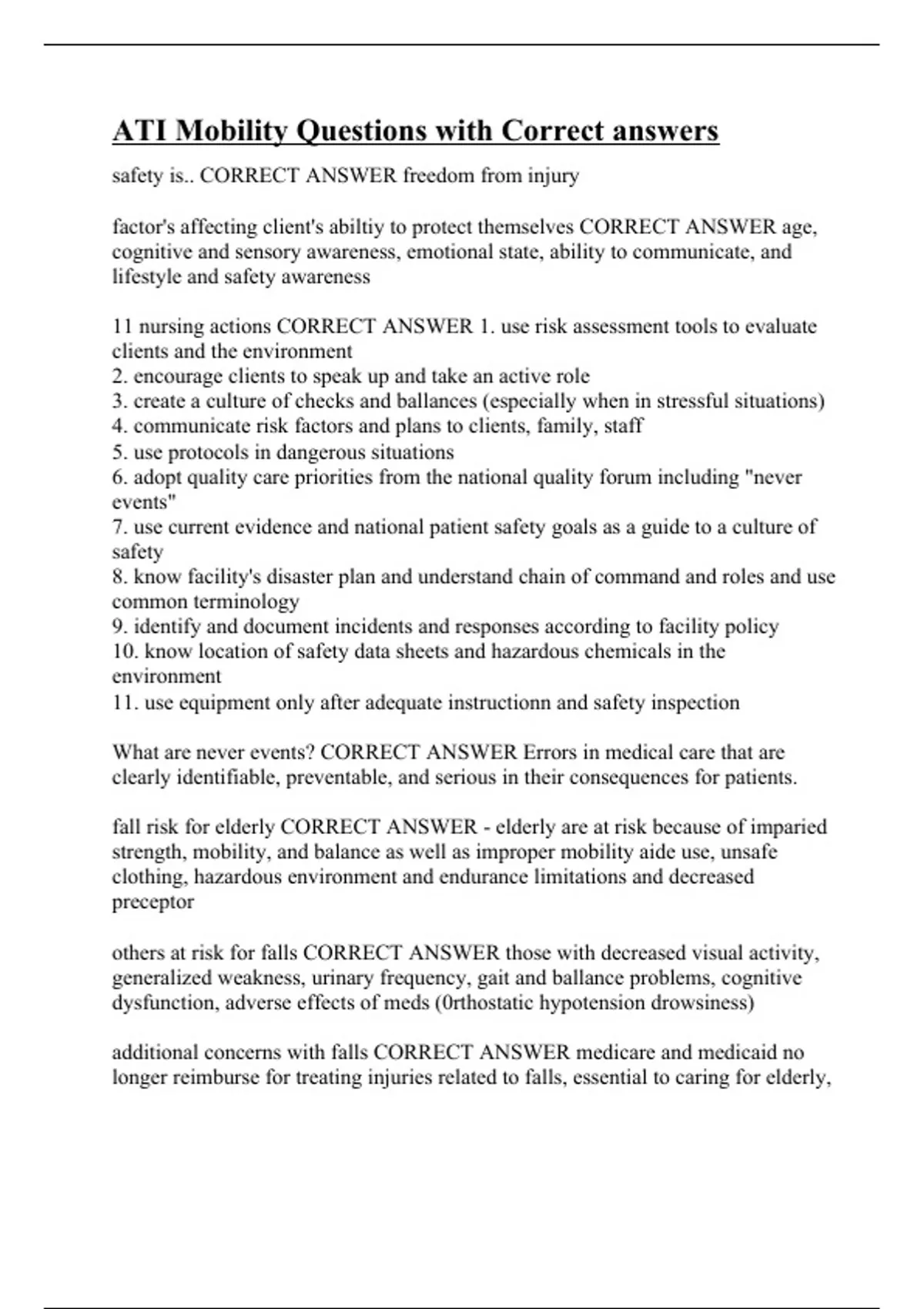 safety is.. CORRECT ANSWER freedom from injury factor's affecting client's abiltiy to protect themselves CORRECT ANSWER age, cognitive and sensory awareness, emotional state, ability to communicate, and lifestyle and safety awareness 11 nursing actions CORRECT ANSWER 1. use risk assessment tools to evaluate clients and the environment 2. encourage clients to speak up and take an active role 3. create a culture of checks and ballances (especially when in stressful situations) 4. communicate risk factors and plans to clients, family, staff 5. use protocols in dangerous situations 6. adopt quality care priorities from the national quality forum including "never events" 7. use current evidence and national patient safety goals as a guide to a culture of safety 8. know facility's disaster plan and understand chain of command and roles and use common terminology 9. identify and document incidents and responses according to facility policy 10. know location of safety data sheets and hazardous chemicals in the environment 11. use equipment only after adequate instructionn and safety inspection What are never events? CORRECT ANSWER Errors in medical care that are clearly identifiable, preventable, and serious in their consequences for patients. fall risk for elderly CORRECT ANSWER - elderly are at risk because of imparied strength, mobility, and balance as well as improper mobility aide use, unsafe clothing, hazardous environment and endurance limitations and decreased preceptor others at risk for falls CORRECT ANSWER those with decreased visual activity, generalized weakness, urinary frequency, gait and ballance problems, cognitive dysfunction, adverse effects of meds (0rthostatic hypotension drowsiness) additional concerns with falls CORRECT ANSWER medicare and medicaid no longer reimburse for treating injuries related