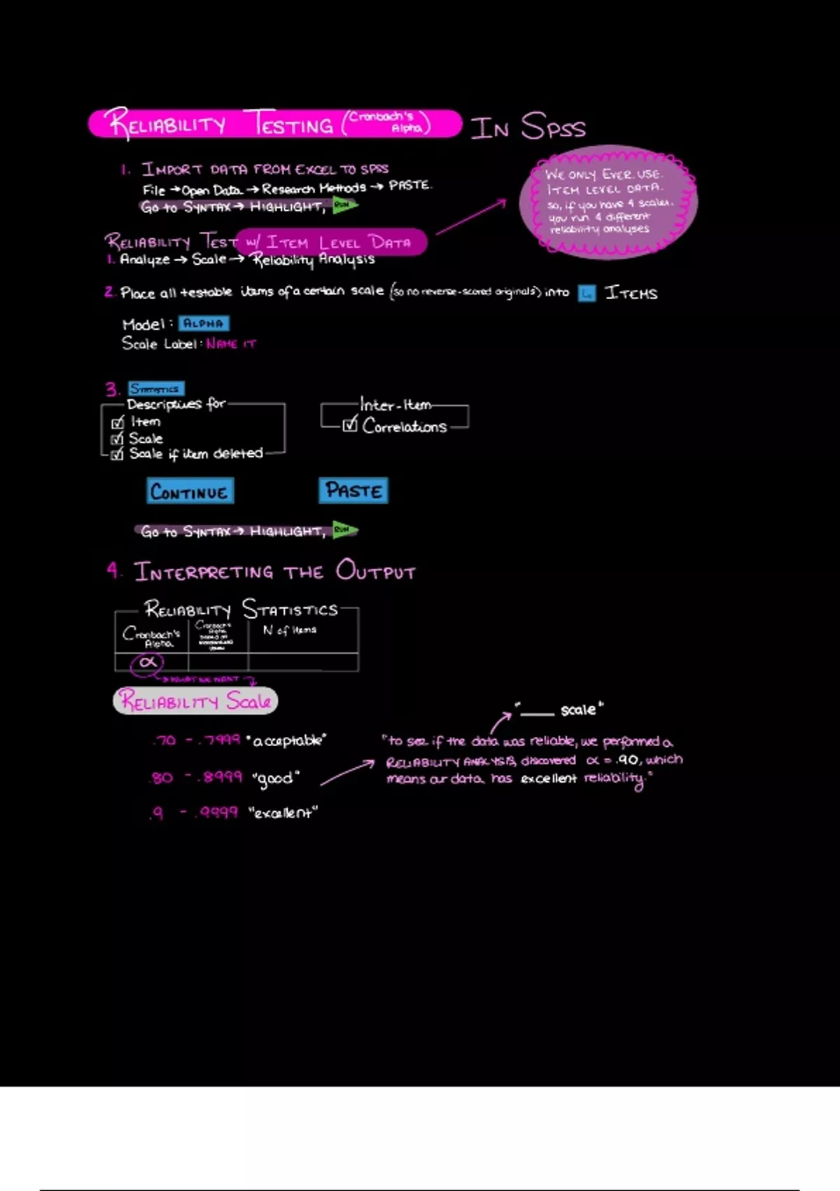 This includes steps for testing the reliability of a set of data in SPSS, as well as how to properly report findings.