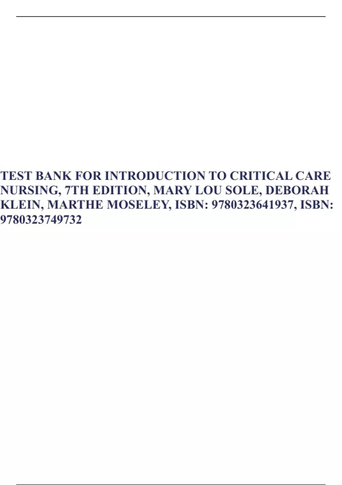 TEST BANK FOR INTRODUCTION TO CRITICAL CARE NURSING, 7TH EDITION, MARY LOU SOLE, DEBORAH KLEIN, MARTHE MOSELEY, ISBN: 9780323641937, ISBN: 9780323749732