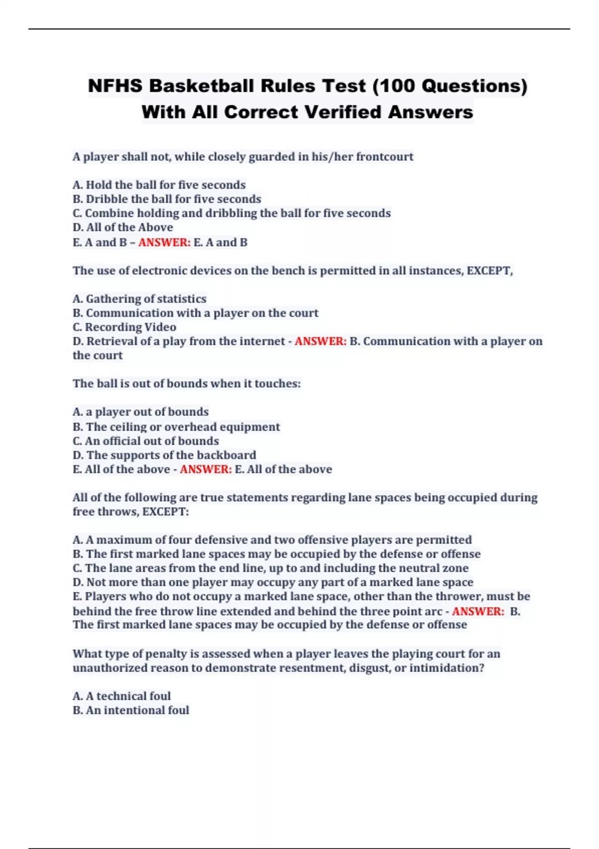 NFHS Basketball Rules Test (100 Questions) With All Correct Verified Answers