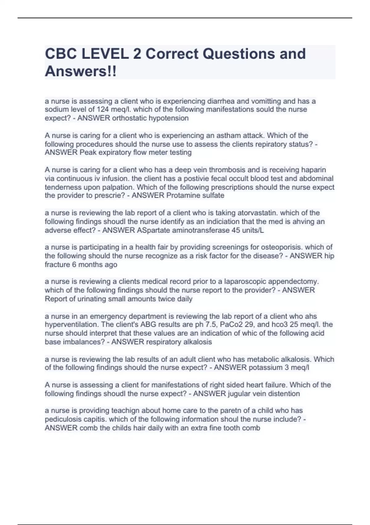 A nurse is caring for a client who has a deep vein thrombosis and is receiving haparin via continuous iv infusion. the client has a postivie fecal occult blood test and abdominal tenderness upon palpation. Which of the following prescriptions should the nurse expect the provider to prescrie? - ANSWER Protamine sulfate a nurse is reviewing the lab report of a client who is taking atorvastatin. which of the following findings shoudl the nurse identify as an indiciation that the med is ahving an adverse effect? - ANSWER ASpartate aminotransferase 45 units/L a nurse is participating in a health fair by providing screenings for osteoporisis. which of the following should the nurse recognize as a risk factor for the disease? - ANSWER hip fracture 6 months ago a nurse is reviewing a clients medical record prior to a laparoscopic appendectomy. which of the following findings should the nurse report to the provider? - ANSWER Report of urinating small amounts twice daily a nurse in an emergency department is reviewing the lab report of a client who ahs hyperventilation. The client's ABG results are ph 7.5, PaCo2 29, and hco3 25 meq/l. the nurse should interpret that these values are an indication of whic of the following acid base imbalances? - ANSWER respiratory alkalosis a nurse is reviewing the lab results of an adult client who has metabolic alkalosis. Which of the following findings should the nurse expect? - ANSWER potassium 3 meq/l A nurse is assessing a client for manifestations of right sided heart failure. Which of the following findings shoudl the nurse expect? - ANSWER jugular vein distention a nurse is providing teachign about home care to the paretn of a child who has pediculosis capitis. which of the following information shoul the nurse include? - ANSWER comb the childs hair daily with an extra fine tooth comb