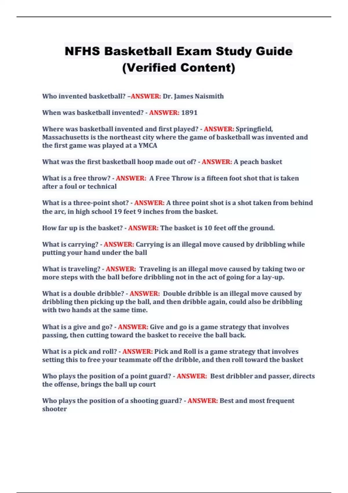 NFHS Basketball Exam Study Guide (Verified Content)