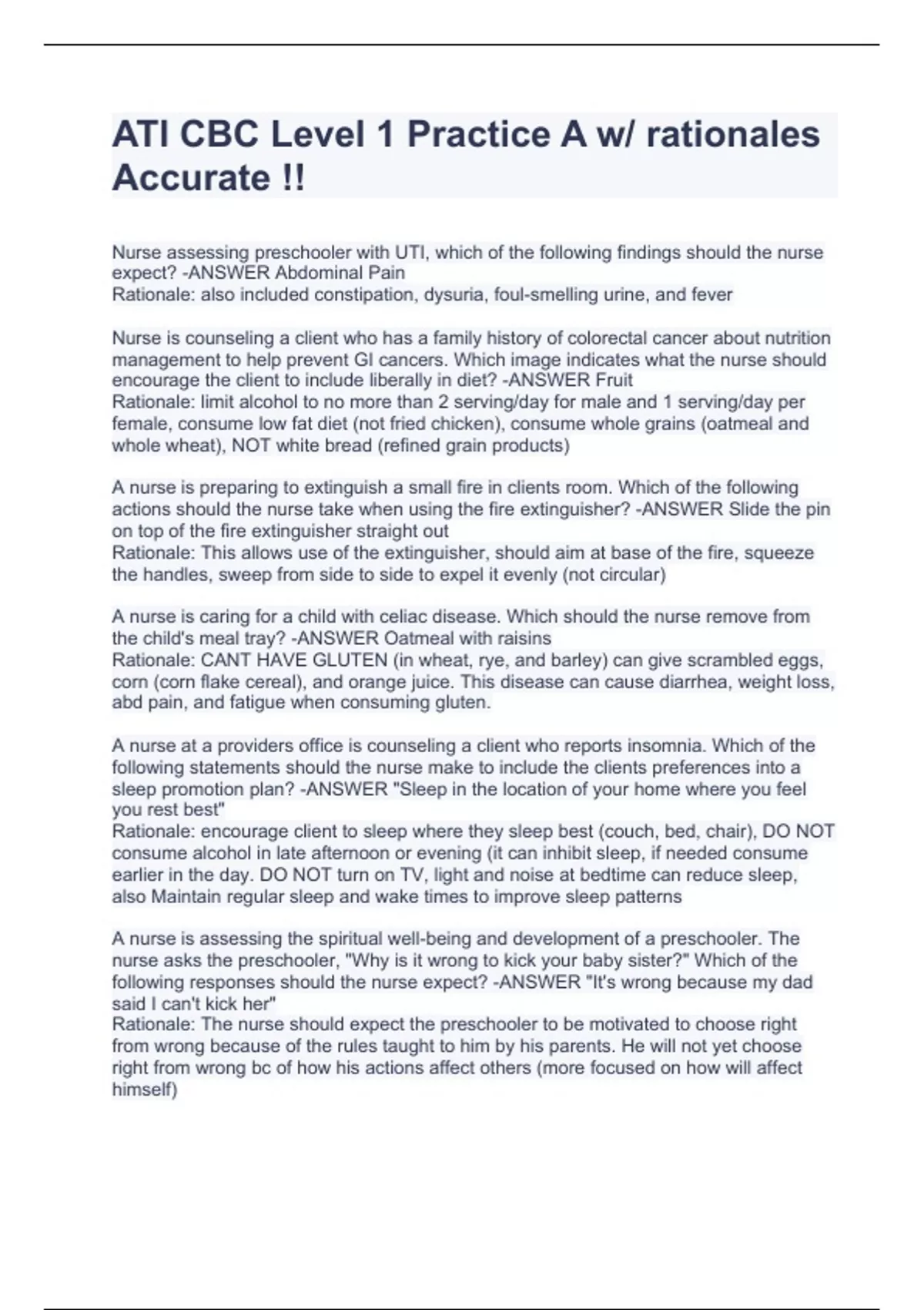 ATI CBC Level 1 Practice A w/ rationales Accurate !!