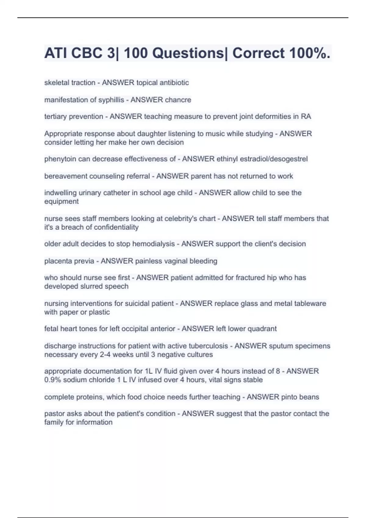 Appropriate response about daughter listening to music while studying - ANSWER consider letting her make her own decision phenytoin can decrease effectiveness of - ANSWER ethinyl estradiol/desogestrel bereavement counseling referral - ANSWER parent has not returned to work indwelling urinary catheter in school age child - ANSWER allow child to see the equipment nurse sees staff members looking at celebrity's chart - ANSWER tell staff members that it's a breach of confidentiality older adult decides to stop hemodialysis - ANSWER support the client's decision placenta previa - ANSWER painless vaginal bleeding who should nurse see first - ANSWER patient admitted for fractured hip who has developed slurred speech nursing interventions for suicidal patient - ANSWER replace glass and metal tableware with paper or plastic fetal heart tones for left occipital anterior - ANSWER left lower quadrant discharge instructions for patient with active tuberculosis - ANSWER sputum specimens necessary every 2-4 weeks until 3 negative cultures appropriate documentation for 1L IV fluid given over 4 hours instead of 8 - ANSWER 0.9% sodium chloride 1 L IV infused over 4 hours, vital signs stable complete proteins, which food choice needs further teaching - ANSWER pinto beans pastor asks about the patient's condition - ANSWER suggest that the pastor contact the family for information