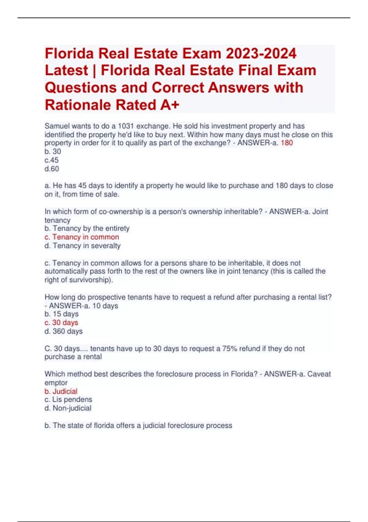 Florida Real Estate Exam Latest | Florida Real Estate Final Exam Questions and Correct Answers with Rationale Rated A+