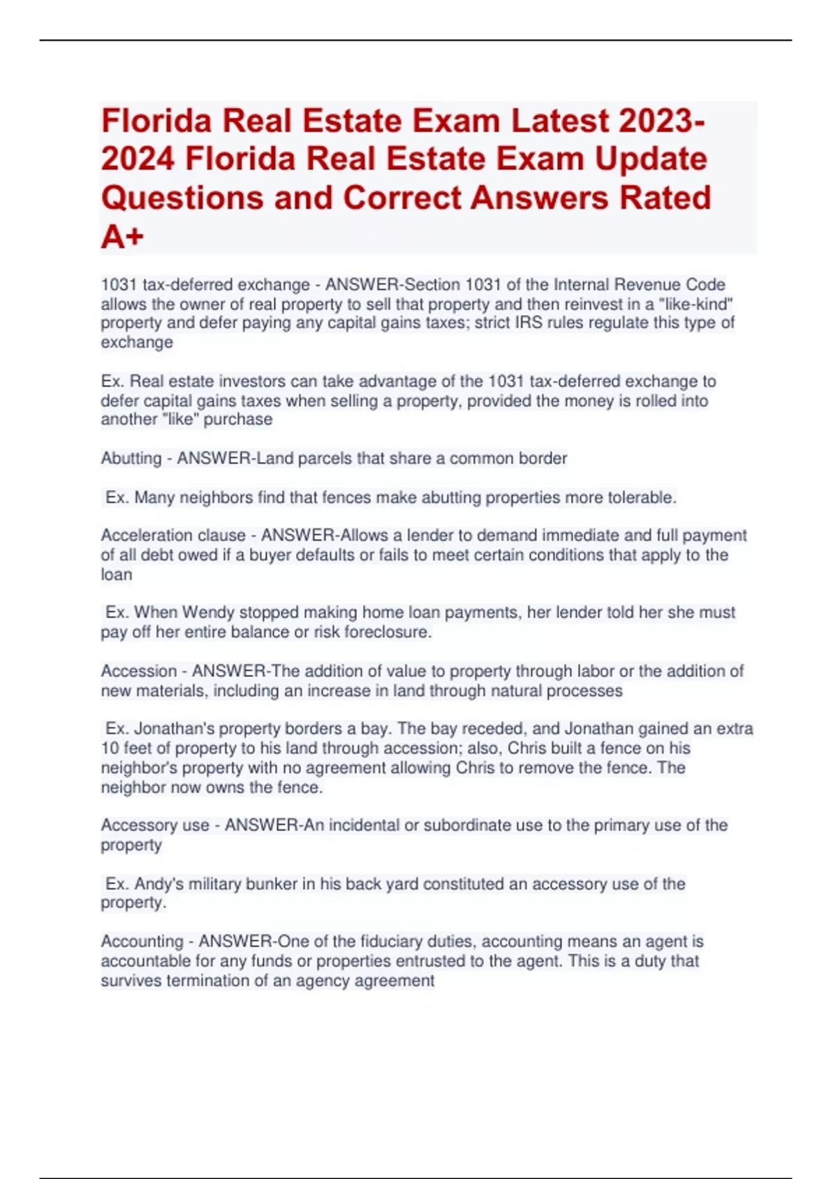 Florida Real Estate Exam Latest Florida Real Estate Exam Update Questions and Correct Answers Rated A+