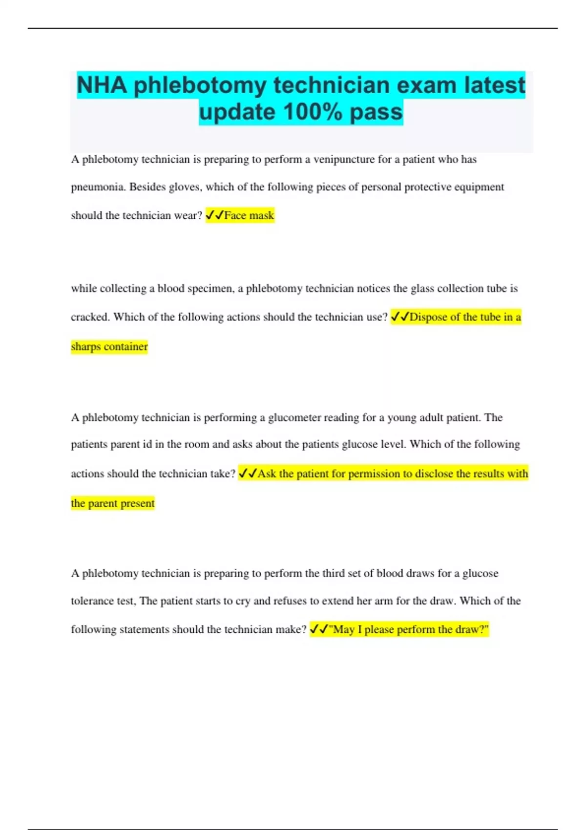 NHA phlebotomy technician exam latest update 100% pass