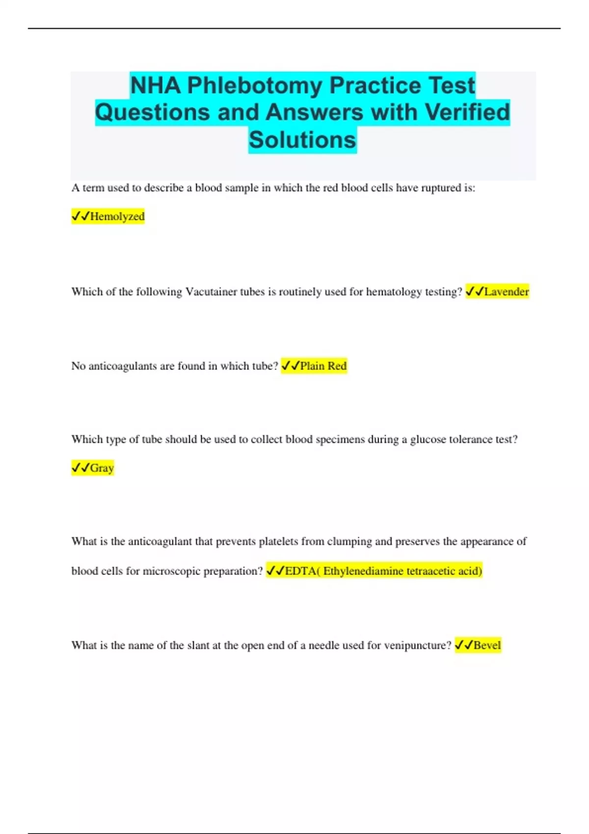 NHA Phlebotomy Practice Test Questions and Answers with Verified Solutions