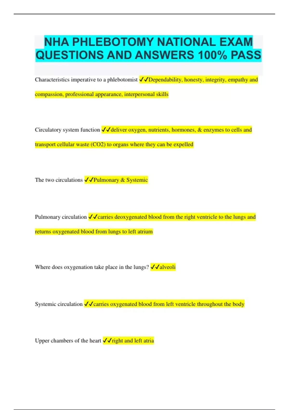 NHA PHLEBOTOMY NATIONAL EXAM QUESTIONS AND ANSWERS 100% PASS