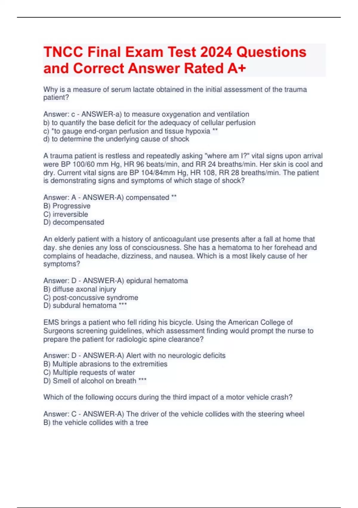TNCC Final Exam Test 2024 Questions and Correct Answer Rated A+