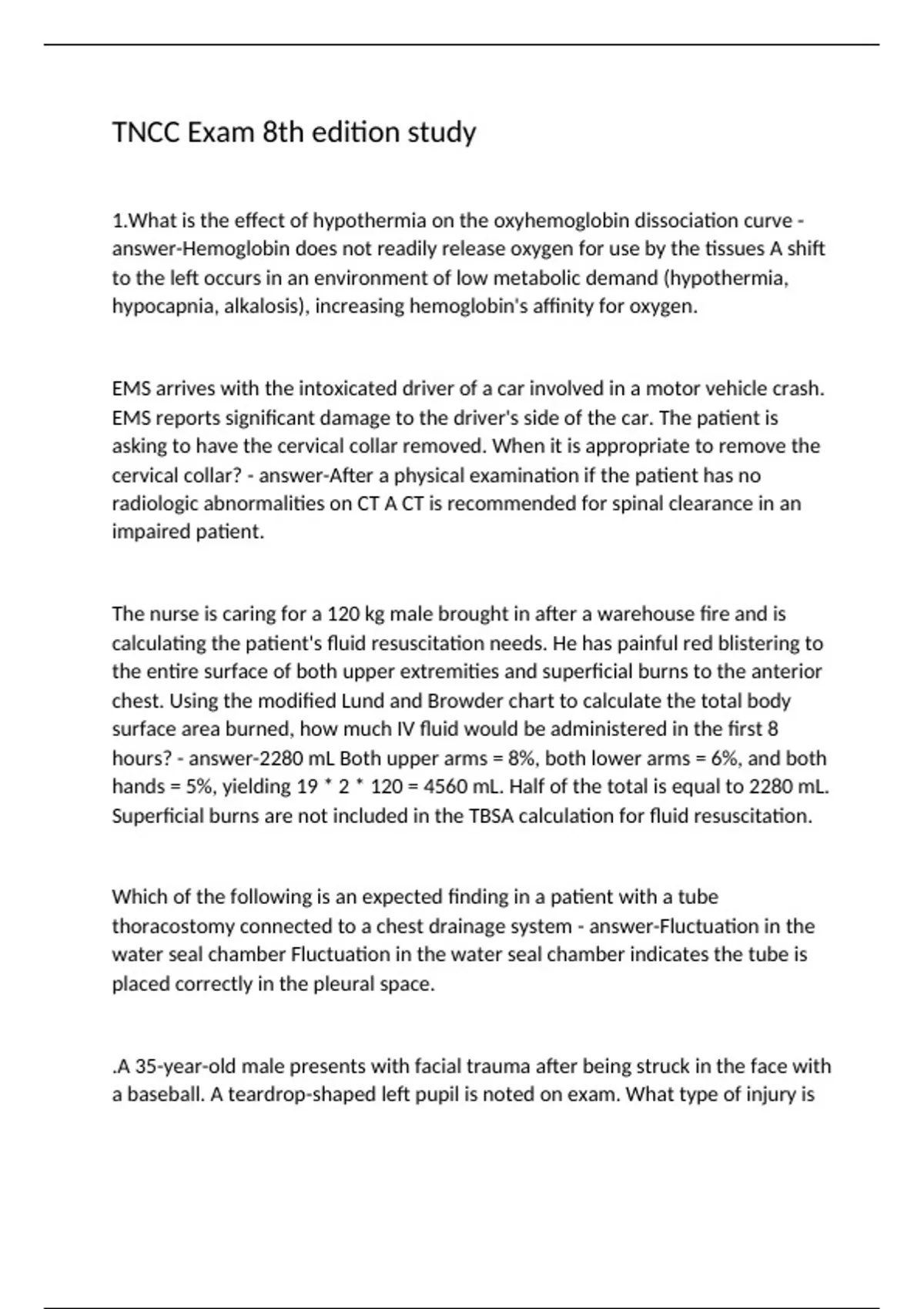 1.What is the effect of hypothermia on the oxyhemoglobin dissociation curve - answer-Hemoglobin does not readily release oxygen for use by the tissues A shift to the left occurs in an environment of low metabolic demand (hypothermia, hypocapnia, alkalosis), increasing hemoglobin's affinity for oxygen. EMS arrives with the intoxicated driver of a car involved in a motor vehicle crash. EMS reports significant damage to the driver's side of the car. The patient is asking to have the cervical collar removed. When it is appropriate to remove the cervical collar? - answer-After a physical examination if the patient has no radiologic abnormalities on CT A CT is recommended for spinal clearance in an impaired patient. The nurse is caring for a 120 kg male brought in after a warehouse fire and is calculating the patient's fluid resuscitation needs. He has painful red blistering to the entire surface of both upper extremities and superficial burns to the anterior chest. Using the modified Lund and Browder chart to calculate the total body surface area burned, how much IV fluid would be administered in the first 8 hours? - answer-2280 mL Both upper arms = 8%, both lower arms = 6%, and both hands = 5%, yielding 19 * 2 * 120 = 4560 mL. Half of the total is equal to 2280 mL. Superficial burns are not included in the TBSA calculation for fluid resuscitation. Which of the following is an expected finding in a patient with a tube thoracostomy connected to a chest drainage system - answer-Fluctuation in the water seal chamber Fluctuation in the water seal chamber indicates the tube is