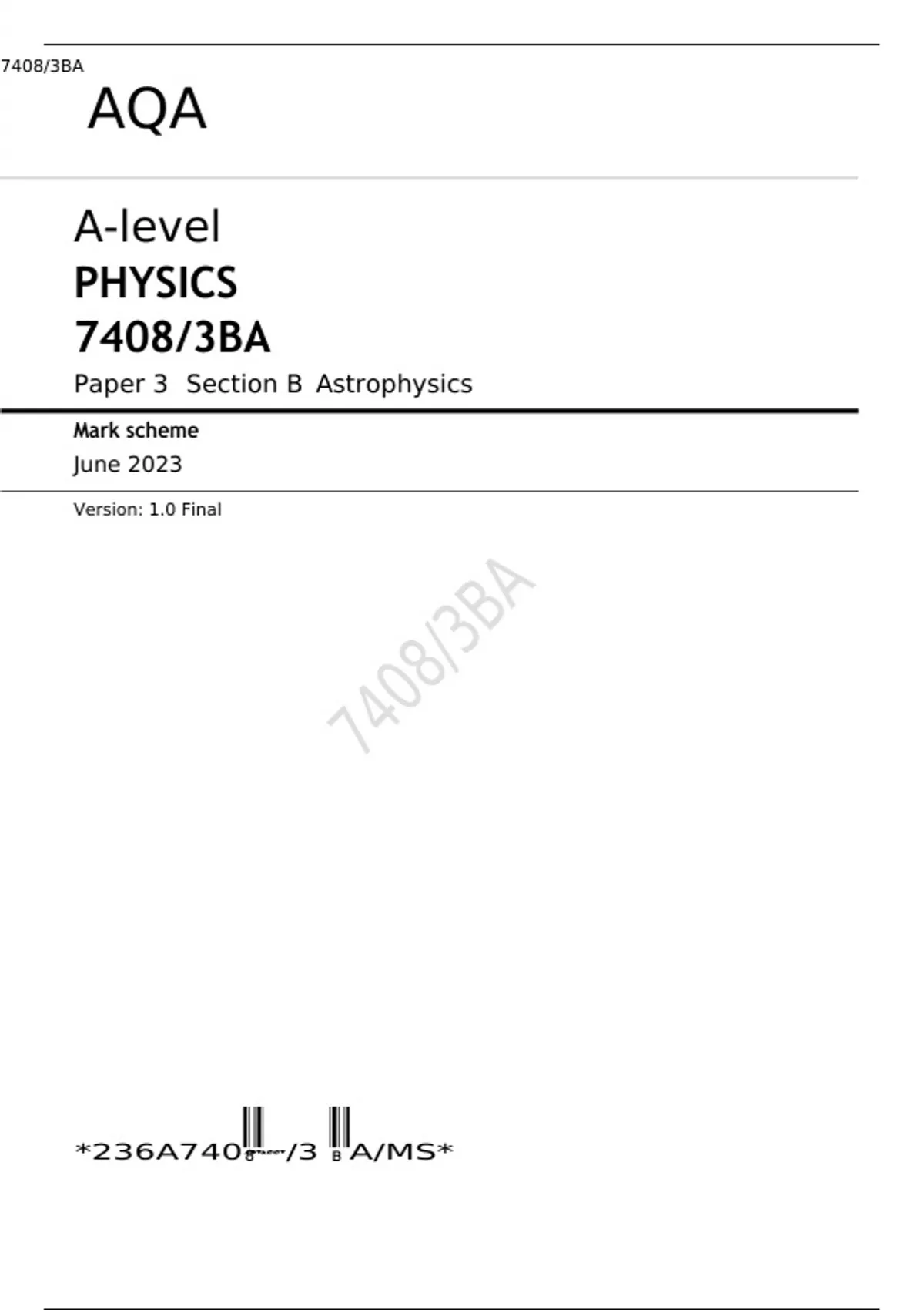 AQA A level PHYSICS Paper Paper 3BA Section B Mark scheme June 2023