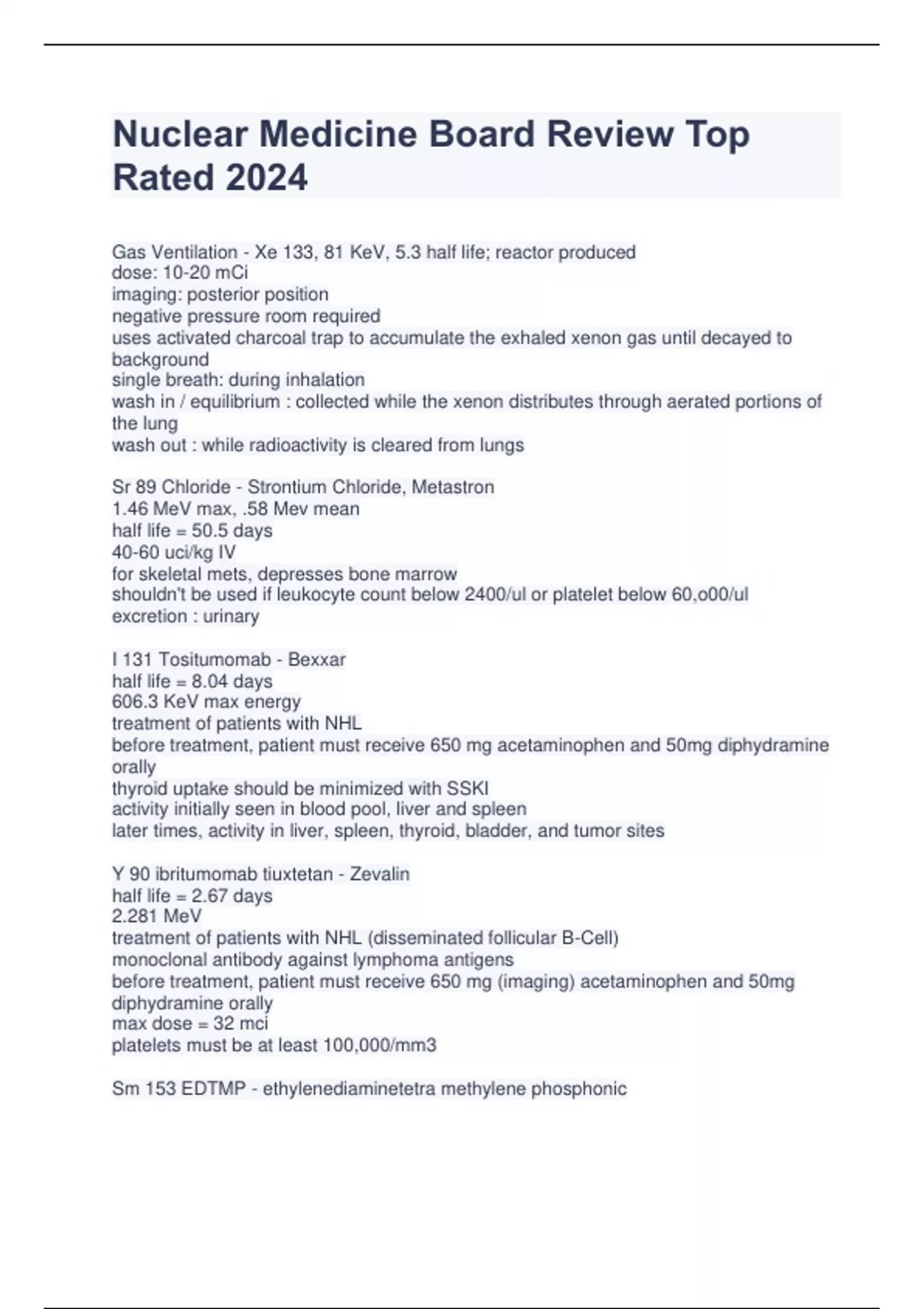 Gas Ventilation - Xe 133, 81 KeV, 5.3 half life; reactor produced dose: 10-20 mCi imaging: posterior position negative pressure room required uses activated charcoal trap to accumulate the exhaled xenon gas until decayed to background single breath: during inhalation wash in / equilibrium : collected while the xenon distributes through aerated portions of the lung wash out : while radioactivity is cleared from lungs Sr 89 Chloride - Strontium Chloride, Metastron 1.46 MeV max, .58 Mev mean half life = 50.5 days 40-60 uci/kg IV for skeletal mets, depresses bone marrow shouldn't be used if leukocyte count below 2400/ul or platelet below 60,o00/ul excretion : urinary I 131 Tositumomab - Bexxar half life = 8.04 days 606.3 KeV max energy treatment of patients with NHL before treatment, patient must receive 650 mg acetaminophen and 50mg diphydramine orally thyroid uptake should be minimized with SSKI activity initially seen in blood pool, liver and spleen later times, activity in liver, spleen, thyroid, bladder, and tumor sites Y 90 ibritumomab tiuxtetan - Zevalin half life = 2.67 days 2.281 MeV treatment of patients with NHL (disseminated follicular B-Cell) monoclonal antibody against lymphoma antigens before treatment, patient must receive 650 mg (imaging) acetaminophen and 50mg diphydramine orally max dose = 32 mci platelets must be at least 100,000/mm3 Sm 153 EDTMP - ethylenediaminetetra methylene phosphonic Quadramet half life = 46.7 hours 0.81 MeV maximum concentrates in bone marrow for patients with more metabolically activate metastases from prostate or breast cancer, as well as those from osteogenic sarcoma 1.0mci/kg urinary excretion Bone therapy blood requirements - 60,000-100,000/ul platelet /ul leukocyte 2000/ul granuolyte I 131 MIBG - metaiodobenzylguanidine half life = 8.06 days localization/treatment of primary or metastatic pheochromocytomas/ neuroblastoma 8.04 days kidney/ urinary excretion I 131 Sodium Iodide - half life = 8.06 days used to treat hyperthyroidism, thyroid carcinoma 10-15 mCi for graves 20-30 mCi for nodular goiters *special release precautions Blood Brain Barrier Imaging - Tc99m Pertechnetate -least desirable (accumulated in choroid plexus) -15-30mCi -premed with KCLO4- preferred Tc99m Pentetate (DTPA) -planar -cleared by kidneys Dynamic imaging: cerebral blood flow static blood pool delayed statics: 3-30 min after 6 sec after tracer: rt and lt carotid and anterior cerebral abnormal: increased localization of RP brain death: tracer distribution in carotids, abscense of perfusion Brain Perfusion - Tc99m exametazime/HMPAO/ceretec Tc99m Biscisate (ECD, neurolite) Lipid soluble, crosses BBB SPECT dimly lit room for injection 10-20mCi approx. 45 min post inject imaging with ECD, and 90 min for HMPAO