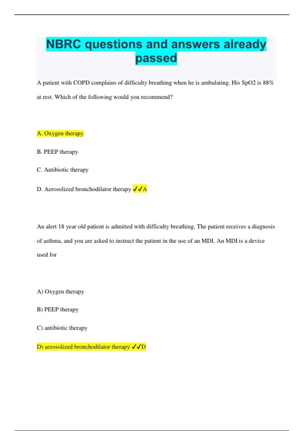 A patient with COPD complains of difficulty breathing when he is ambulating. His SpO2 is 88% at rest. Which of the following would you recommend? A. Oxygen therapy B. PEEP therapy C. Antibiotic therapy D. Aerosolized bronchodilator therapy A