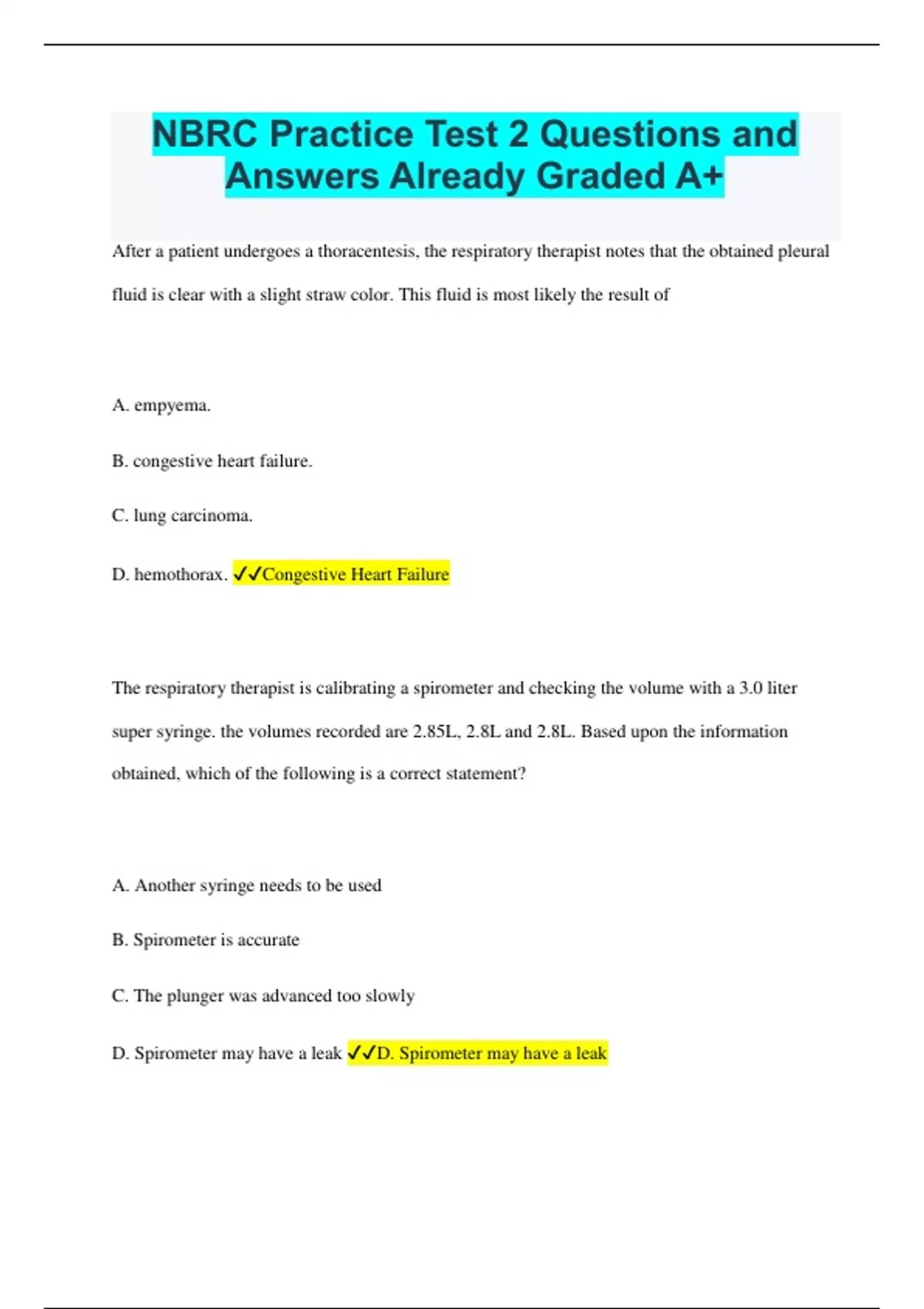 After a patient undergoes a thoracentesis, the respiratory therapist notes that the obtained pleural fluid is clear with a slight straw color. This fluid is most likely the result of A. empyema. B. congestive heart failure. C. lung carcinoma. D. hemothorax. Congestive Heart Failure The respiratory therapist is calibrating a spirometer and checking the volume with a 3.0 liter super syringe. the volumes recorded are 2.85L, 2.8L and 2.8L. Based upon the information obtained, which of the following is a correct statement? A. Another syringe needs to be used B. Spirometer is accurate C. The plunger was advanced too slowly D. Spirometer may have a leak D. Spirometer may have a leak