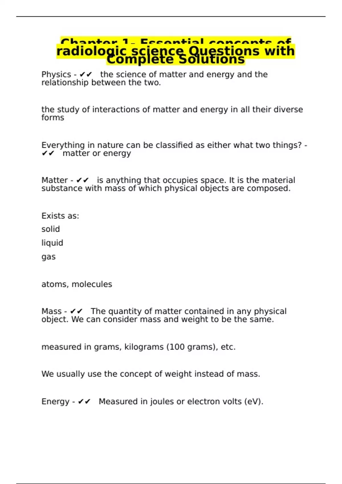 Physics - the science of matter and energy and the relationship between the two. the study of interactions of matter and energy in all their diverse forms Everything in nature can be classified as either what two things? - matter or energy Matter - is anything that occupies space. It is the material substance with mass of which physical objects are composed. Exists as: solid liquid gas atoms, molecules Mass - The quantity of matter contained in any physical object. We can consider mass and weight to be the same. measured in grams, kilograms (100 grams), etc. We usually use the concept of weight instead of mass. Energy - Measured in joules or electron volts (eV). is the ability to do work. Types of energy - - potential energy -kinetic energy -chemical energy -electrical energy -thermal energy -nuclear energy -electromagnetic energy- used in X-ray imaging potential energy - is the ability to do work by virtue of position. Kinetic energy - is the energy of motion chemical energy - is the energy released by a chemical reaction. Ex: type of energy is that which is provided to our bodies through chemical reactions involving the foods we eat. EX: battery Electrical energy - represents the work that can be done when an electron moves through an electric potential difference (voltage). Ex: all electric apparatus, such as motors, heaters, and blowers, function throughout he use of electrical energy. Thermal energy (heat) - is the energy of motion at the molecular level. It is kinetic energy of molecules and is closely related to temperature. The faster the molecules of a substance are vibrating, the more thermal energy the substance has and the higher is its temperature. Nuclear energy - is the energy that is contained within the nucleus of an atom. We control the release and use of this type of energy in electric nuclear power plants.