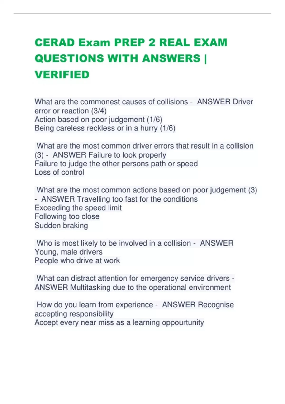 CERAD Exam PREP 2 REAL EXAM QUESTIONS WITH ANSWERS | VERIFIED What are the commonest causes of collisions - ANSWER Driver error or reaction (3/4) Action based on poor judgement (1/6) Being careless reckless or in a hurry (1/6) What are the most common driver errors that result in a collision (3) - ANSWER Failure to look properly Failure to judge the other persons path or speed Loss of control What are the most common actions based on poor judgement (3) - ANSWER Travelling too fast for the conditions Exceeding the speed limit Following too close Sudden braking Who is most likely to be involved in a collision - ANSWER Young, male drivers People who drive at work What can distract attention for emergency service drivers - ANSWER Multitasking due to the operational environment How do you learn from experience - ANSWER Recognise accepting responsibility Accept every near miss as a learning oppourtunity What are the four levels of the driving task - ANSWER Human factors that affect your driving The purpose and context of your journey Traffic situations Vehicle and vehicle control What human factors can affect your driving? - ANSWER Attitude, emotions, mood, tiredness, stress, impulsive personality, operational stress, competitiveness, financial problems How can the journey affect your driving - ANSWER Preparation needed, best route, what distractions, operational distractions, time pressure, peer pressure, red mist, fatigue How can the traffic affect your driving - ANSWER Traffic creates hazards, situational awareness is essential, risks include loss of concentration, failure to look properly or weather How does the vehicle affect your driving - ANSWER Need to know what your vehicle can and cannot do, familiarise yourself, check lights, tyres, brakes, capabilities, safety features, an unfamiliar vehicle increases risk What are some human factor risks for emergency service drivers - ANSWER Distraction due to multitasking and in vehicle technology Driving stress Operational stressors Time pressure and the purpose of the journey 'Noble cause' risk taking Red mist Examples of operational stressors - ANSWER Anticipatory stress of a difficult job Adrenaline rush Stress related to aspects of the task Stress of extreme hazards Stress due to exposure of repeating incidents Preoccupation with a previous error or judgement Stress from other work factors eg shift work Pressure, stress and tiredness can release what feelings - ANSWER Impatience- a desire to get to the incident quickly Intolerance- a belief that the importance of the task automatically gives the driver priority Impulsiveness- rushing decisions Anger or frustration Personalisation- conflict with other road users