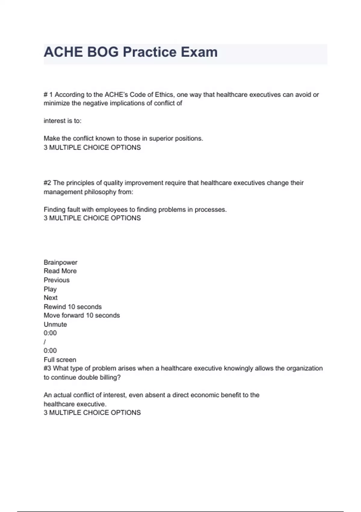 ACHE BOG Practice Exam Questions And Answers # 1 According to the ACHE’s Code of Ethics, one way that healthcare executives can avoid or minimize the negative implications of conflict of interest is to: Make the conflict known to those in superior positions. 3 MULTIPLE CHOICE OPTIONS #2 The principles of quality improvement require that healthcare executives change their management philosophy from: Finding fault with employees to finding problems in processes. 3 MULTIPLE CHOICE OPTIONS Brainpower Read More Previous Play Next Rewind 10 seconds Move forward 10 seconds Unmute 0:00 / 0:00 Full screen #3 What type of problem arises when a healthcare executive knowingly allows the organization to continue double billing? An actual conflict of interest, even absent a direct economic benefit to the healthcare executive. 3 MULTIPLE CHOICE OPTIONS #4 Which of the following is a unit of measure commonly used to determine physicians’ clinical productivity? RVU 3 MULTIPLE CHOICE OPTIONS #5 Which of the following third-party reimbursement methods provides the largest financial incentive for the provider to reduce cost? Prospective payment 3 MULTIPLE CHOICE OPTIONS #6 Statements of earnings, financial positions, changes in financial position and retained earnings are required to be submitted yearly by all: Publicly owned healthcare organizations. 3 MULTIPLE CHOICE OPTIONS #181 In a healthcare organization, who has ultimate fiduciary responsibility? Board of directors 3 MULTIPLE CHOICE OPTIONS #182 Medicare DRG payment is highly dependent upon a hospital’s case mix index. This index represents the average relative weight for all Medicare patients treated in a: Specific period 3 MULTIPLE CHOICE OPTIONS #183 If a CEO wanted to look at a “snapshot” of the financial condition of the healthcare organization, he/she would review which of the following? Balance Sheet 3 MULTIPLE CHOICE OPTIONS #184 Where should charity care be shown in a healthcare organization’s financial statement? In the notes to the financial statements 3 MULTIPLE CHOICE OPTIONS #185 Which of the following is the best way to assign costs in responsibility management Assign costs to the department manager who is responsible for making decisions about those costs 3 MULTIPLE CHOICE OPTIONS