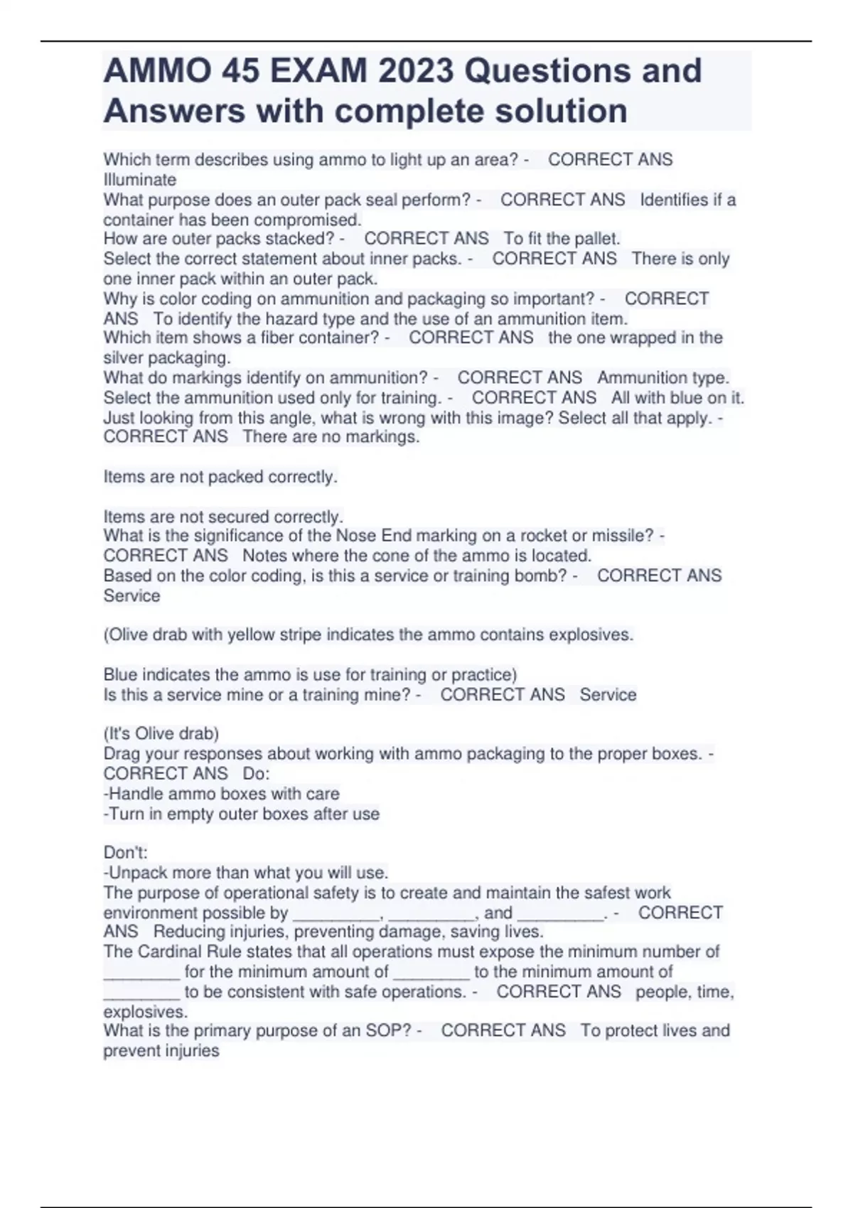 Which term describes using ammo to light up an area? - CORRECT ANS Illuminate What purpose does an outer pack seal perform? - CORRECT ANS Identifies if a container has been compromised. How are outer packs stacked? - CORRECT ANS To fit the pallet. Select the correct statement about inner packs. - CORRECT ANS There is only one inner pack within an outer pack. Why is color coding on ammunition and packaging so important? - CORRECT ANS To identify the hazard type and the use of an ammunition item. Which item shows a fiber container? - CORRECT ANS the one wrapped in the silver packaging. What do markings identify on ammunition? - CORRECT ANS Ammunition type. Select the ammunition used only for training. - CORRECT ANS All with blue on it. Just looking from this angle, what is wrong with this image? Select all that apply. - CORRECT ANS There are no markings. Items are not packed correctly. Items are not secured correctly. What is the significance of the Nose End marking on a rocket or missile? - CORRECT ANS Notes where the cone of the ammo is located. Based on the color coding, is this a service or training bomb? - CORRECT ANS Service (Olive drab with yellow stripe indicates the ammo contains explosives. Blue indicates the ammo is use for training or practice) Is this a service mine or a training mine? - CORRECT ANS Service (It's Olive drab) Drag your responses about working with ammo packaging to the proper boxes. - CORRECT ANS Do: -Handle ammo boxes with care -Turn in empty outer boxes after use