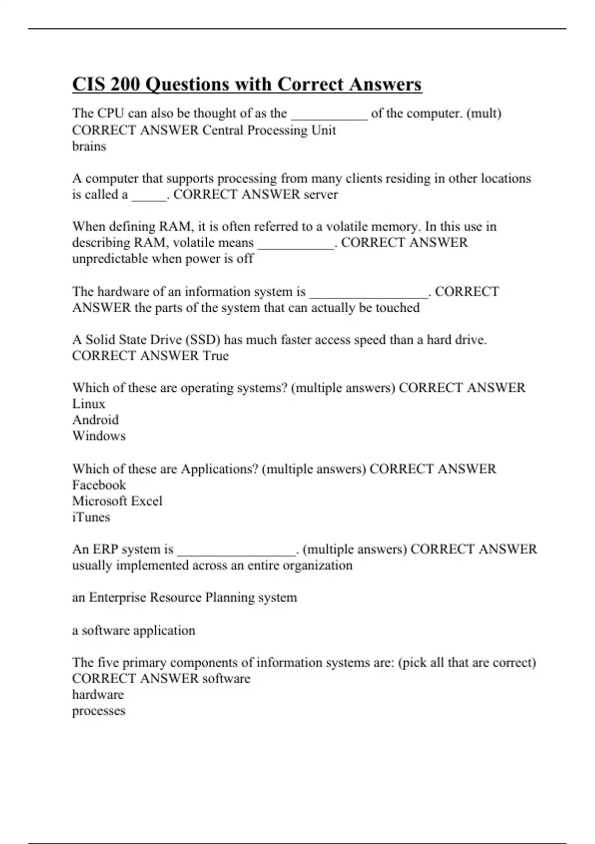 The CPU can also be thought of as the ___________ of the computer. (mult) CORRECT ANSWER Central Processing Unit brains A computer that supports processing from many clients residing in other locations is called a _____. CORRECT ANSWER server When defining RAM, it is often referred to a volatile memory. In this use in describing RAM, volatile means ___________. CORRECT ANSWER unpredictable when power is off The hardware of an information system is _________________. CORRECT ANSWER the parts of the system that can actually be touched A Solid State Drive (SSD) has much faster access speed than a hard drive. CORRECT ANSWER True Which of these are operating systems? (multiple answers) CORRECT ANSWER Linux Android Windows Which of these are Applications? (multiple answers) CORRECT ANSWER Facebook Microsoft Excel iTunes An ERP system is _________________. (multiple answers) CORRECT ANSWER usually implemented across an entire organization an Enterprise Resource Planning system