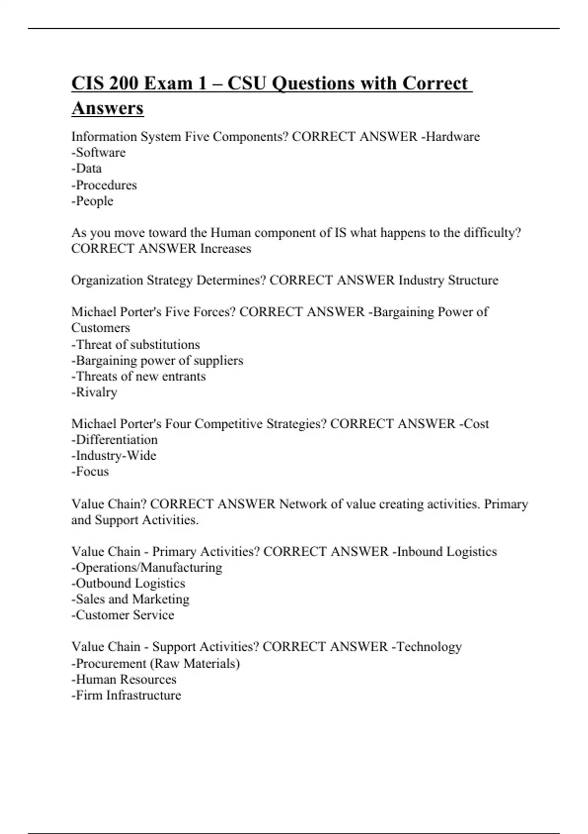 Information System Five Components? CORRECT ANSWER -Hardware -Software -Data -Procedures -People As you move toward the Human component of IS what happens to the difficulty? CORRECT ANSWER Increases Organization Strategy Determines? CORRECT ANSWER Industry Structure Michael Porter's Five Forces? CORRECT ANSWER -Bargaining Power of Customers -Threat of substitutions -Bargaining power of suppliers -Threats of new entrants -Rivalry Michael Porter's Four Competitive Strategies? CORRECT ANSWER -Cost -Differentiation -Industry-Wide -Focus Value Chain? CORRECT ANSWER Network of value creating activities. Primary and Support Activities. Value Chain - Primary Activities? CORRECT ANSWER -Inbound Logistics -Operations/Manufacturing -Outbound Logistics -Sales and Marketing -Customer Service Value Chain - Support Activities? CORRECT ANSWER -Technology -Procurement (Raw Materials) -Human Resources -Firm Infrastructure