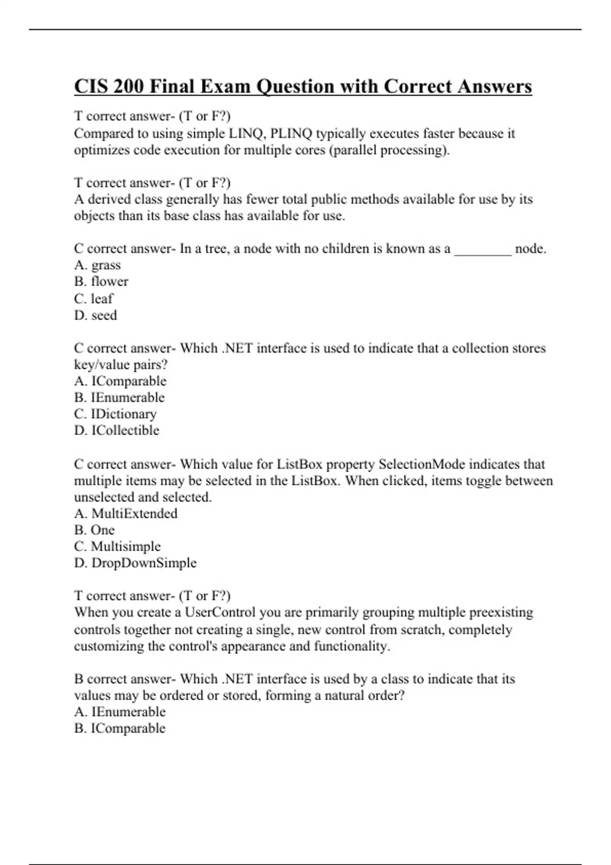 T correct answer- (T or F?) Compared to using simple LINQ, PLINQ typically executes faster because it optimizes code execution for multiple cores (parallel processing). T correct answer- (T or F?) A derived class generally has fewer total public methods available for use by its objects than its base class has available for use. C correct answer- In a tree, a node with no children is known as a ________ node. A. grass B. flower C. leaf D. seed C correct answer- Which .NET interface is used to indicate that a collection stores key/value pairs? A. IComparable B. IEnumerable C. IDictionary D. ICollectible C correct answer- Which value for ListBox property SelectionMode indicates that multiple items may be selected in the ListBox. When clicked, items toggle between unselected and selected. A. MultiExtended B. One C. Multisimple D. DropDownSimple T correct answer- (T or F?) When you create a UserControl you are primarily grouping multiple preexisting controls together not creating a single, new control from scratch, completely customizing the control's appearance and functionality. B correct answer- Which .NET interface is used by a class to indicate that its values may be ordered or stored, forming a natural order? A. IEnumerable B. IComparable