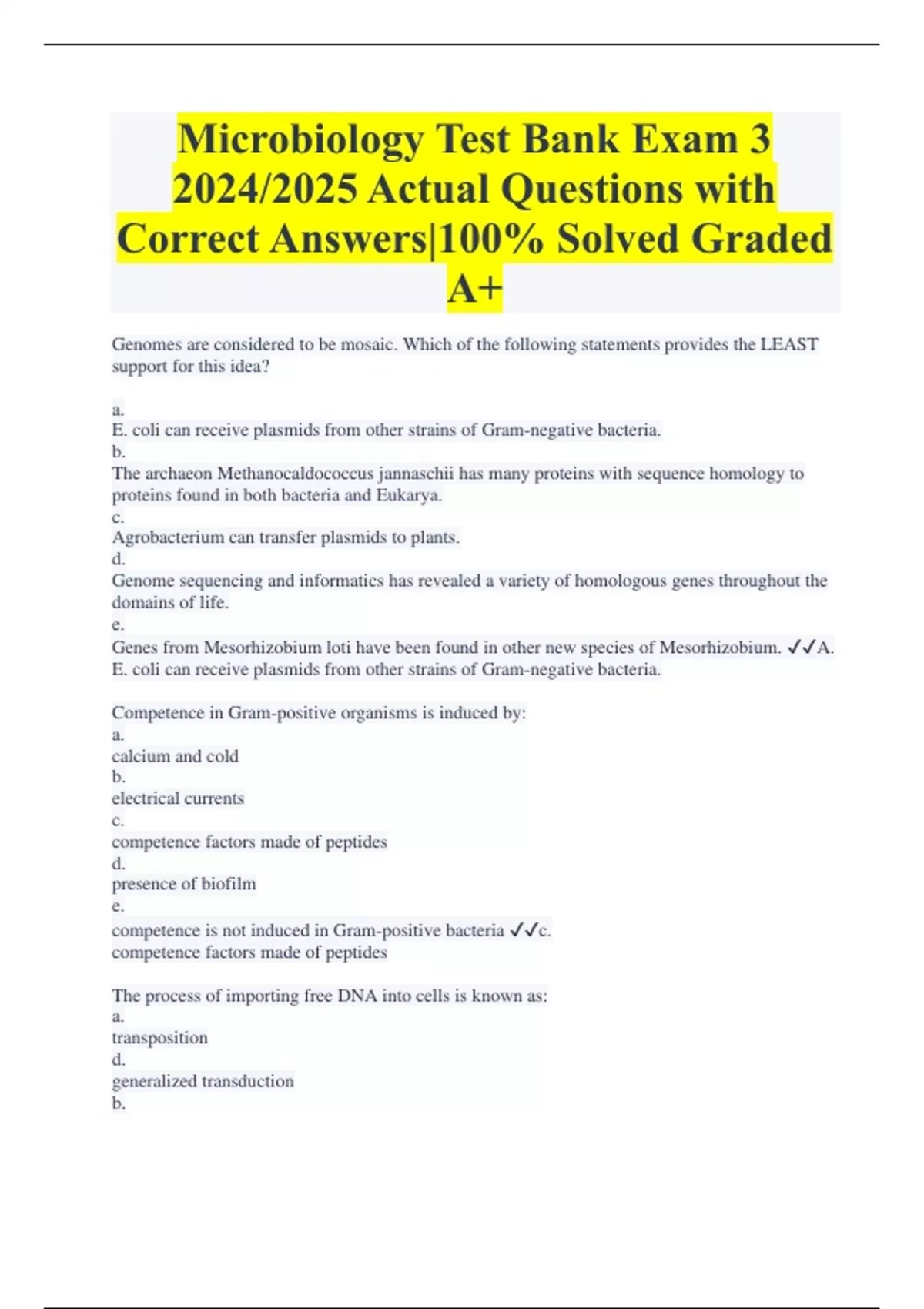 Microbiology Test Bank Exam 3 2024/2025 Actual Questions with Correct Answers|100% Solved Graded A+ Genomes are considered to be mosaic. Which of the following statements provides the LEAST support for this idea? a. E. coli can receive plasmids from other strains of Gram-negative bacteria. b. The archaeon Methanocaldococcus jannaschii has many proteins with sequence homology to proteins found in both bacteria and Eukarya. c. Agrobacterium can transfer plasmids to plants. d. Genome sequencing and informatics has revealed a variety of homologous genes throughout the domains of life. e. Genes from Mesorhizobium loti have been found in other new species of Mesorhizobium. A. E. coli can receive plasmids from other strains of Gram-negative bacteria. Competence in Gram-positive organisms is induced by: a. calcium and cold b. electrical currents c. competence factors made of peptides
