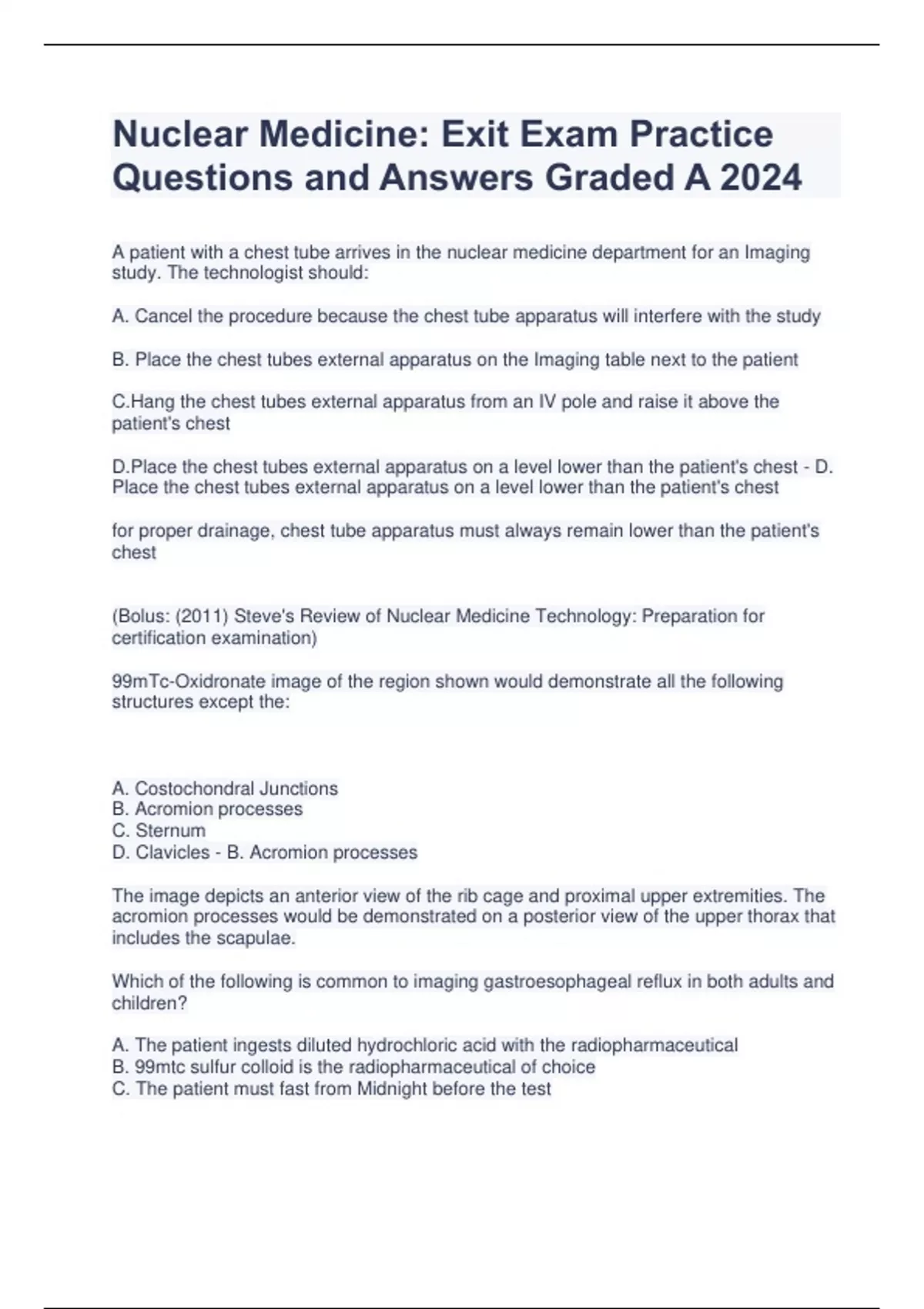 A patient with a chest tube arrives in the nuclear medicine department for an Imaging study. The technologist should: A. Cancel the procedure because the chest tube apparatus will interfere with the study B. Place the chest tubes external apparatus on the Imaging table next to the patient C.Hang the chest tubes external apparatus from an IV pole and raise it above the patient's chest D.Place the chest tubes external apparatus on a level lower than the patient's chest - D. Place the chest tubes external apparatus on a level lower than the patient's chest for proper drainage, chest tube apparatus must always remain lower than the patient's chest (Bolus: (2011) Steve's Review of Nuclear Medicine Technology: Preparation for certification examination) 99mTc-Oxidronate image of the region shown would demonstrate all the following structures except the: A. Costochondral Junctions B. Acromion processes C. Sternum D. Clavicles - B. Acromion processes The image depicts an anterior view of the rib cage and proximal upper extremities. The acromion processes would be demonstrated on a posterior view of the upper thorax that includes the scapulae. Which of the following is common to imaging gastroesophageal reflux in both adults and children? A. The patient ingests diluted hydrochloric acid with the radiopharmaceutical B. 99mtc sulfur colloid is the radiopharmaceutical of choice C. The patient must fast from Midnight before the test D. An abdominal binder is used to increase pressure over the abdomen - B. 99mtc sulfur colloid is the radiopharmaceutical of choice 99mTc-Sulfur Colloid is the radiopharmaceutical used to image gastroesophageal reflux in both adults and children. However, adults are administered a mixture of dilute hydrochloric acid, orange juice and tracer after fasting from midnight. In infants and toddlers, the procedure is performed at the time of a scheduled feeding, so they may fast as little as two hours before receiving the tracer. In adults, an abdominal binder is used to increase external abdominal pressure to demonstrate more subtle instances of reflux. Because the abdominal muscles are important in pediatric respiration, the binder is typically not used with children, particularly infants. The shelf life of most 99mTc-labeled radiopharmaceuticals is: A. 4-6 hrs B. 6-8 hrs C. 10-12 hrs D. 16-18 hrs - B. 6-8hrs For most 99mTc-Radiopharmaceuticals, the expiration time is 6 hrs, equal to the physical half-life of 99mTC (t1/2= 6 hrs) On an intrinsic field uniformity image, the area of increased activity around the image is called: A. Flare phenomenon B. Septal penetration C. Edge packing D. Halo effect - C. Edge packing The phenomenon known as Edge packing can show up as a bright rim of activity around the perimeter of the [intrinsic flood]. To prevent Edge packing, most manufacturers provide a lead- shielded ring that masks the effect when attached to the edge of the camera head. A patient who becomes hypoglycemic may exhibit all the following signs and symptoms except: A. Weakness and shakiness B. Irritability C. Nausea and vomiting D. Confusion - C. Nausea and vomiting The onset of symptoms of hypoglycemia may be sudden and include general weakness, sweating, clammy, cold skin, tremors, nervousness, irritability, hunger, blurred vision and loss of consciousness. The condition can be remedied quickly with the administration of sugar (3 pieces of candy or fruit juice)