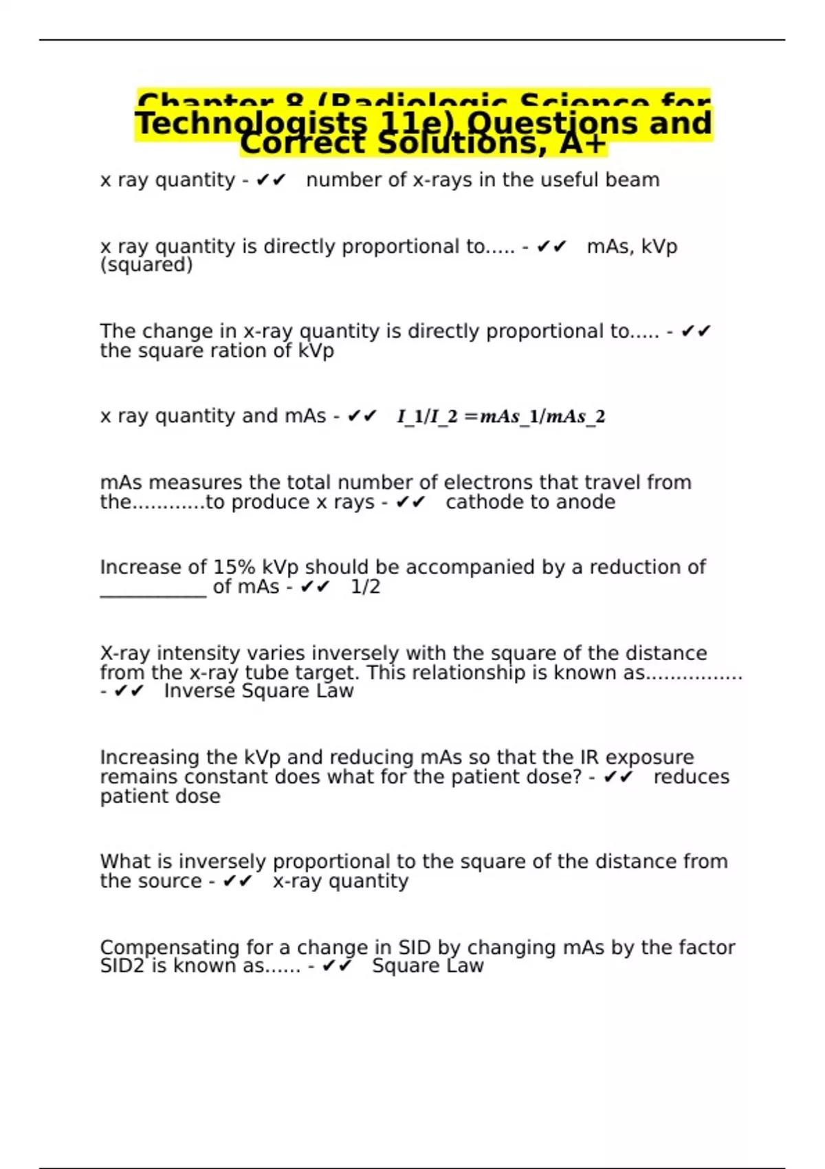 Chapter 8 (Radiologic Science for Technologists 11e) Questions and Correct Solutions, A+