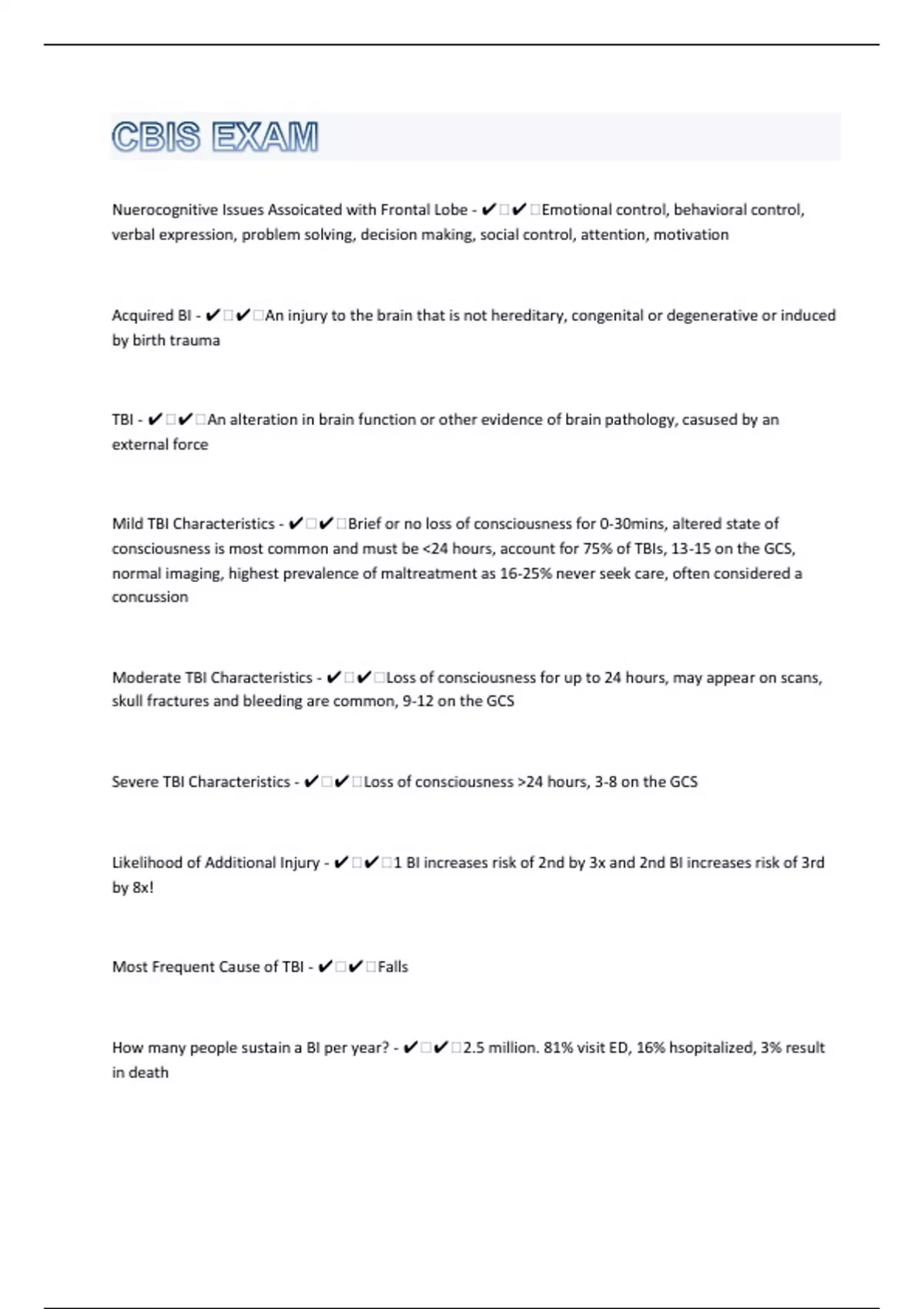 Nuerocognitive Issues Assoicated with Frontal Lobe - ️️Emotional control, behavioral control, verbal expression, problem solving, decision making, social control, attention, motivation Acquired BI - ️️An injury to the brain that is not hereditary, congenital or degenerative or induced by birth trauma TBI - ️️An alteration in brain function or other evidence of brain pathology, casused by an external force Mild TBI Characteristics - ️️Brief or no loss of consciousness for 0-30mins, altered state of consciousness is most common and must be <24 hours, account for 75% of TBIs, 13-15 on the GCS, normal imaging, highest prevalence of maltreatment as 16-25% never seek care, often considered a concussion Moderate TBI Characteristics - ️️Loss of consciousness for up to 24 hours, may appear on scans, skull fractures and bleeding are common, 9-12 on the GCS Severe TBI Characteristics - ️️Loss of consciousness >24 hours, 3-8 on the GCS Likelihood of Additional Injury - ️️1 BI increases risk of 2nd by 3x and 2nd BI increases risk of 3rd by 8x! Most Frequent Cause of TBI - ️️Falls How many people sustain a BI per year? - ️️2.5 million. 81% visit ED, 16% hsopitalized, 3% result in death