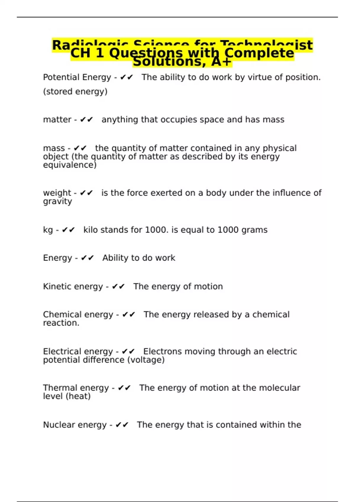 Potential Energy - The ability to do work by virtue of position. (stored energy) matter - anything that occupies space and has mass mass - the quantity of matter contained in any physical object (the quantity of matter as described by its energy equivalence) weight - is the force exerted on a body under the influence of gravity kg - kilo stands for 1000. is equal to 1000 grams Energy - Ability to do work Kinetic energy - The energy of motion Chemical energy - The energy released by a chemical reaction. Electrical energy - Electrons moving through an electric potential difference (voltage) Thermal energy - The energy of motion at the molecular level (heat) Nuclear energy - The energy that is contained within the nucleus of an atom Electromagnetic energy - Type of energy used in x-ray imaging. x-rays, gamma rays, radio waves, microwaves, and ultraviolet, infrared and visible light. It does not include sound electromagnetic radiation - electromagnetic energy which is radiated irradiated/exposed - a matter that intercepts radiation and absorbs part or all of it. A patient is irradiated when exposed to X-ray Ion - An atom that has gained or lost an electron. radiation - the transfer of energy Ionization - the removal of an electron from an atom. ionizing radiation - any type of radiation that is capable of removing an orbital electron from the atom with which it interacts. sources of ionizing radiation - natural environmental radiation (annual dose 3 millisieverts mSv) and man-made radiation (annual dose 3.2 mSv) unit of measurement of radiation - mSv - millisievert natural environmental radiation - cosmic rays, terrestrial radiation, internally deposited radionuclides and radon cosmic rays - are particulate and electromagnetic radiation emitted by the sun and stars (.3 mSv) terrestrial radiation - results from deposits of uranium, thorium and other radionuclides in the earth (.3 mSv) radon - a radioactive gas that is produced by natural radioactive decay of uranium in the earth (.3mSv) medical - mainly x-rays (3.2 mSv) which is 51% of over all radiation exposure (6.3 mSv) xray voltages - unit measure in kilovolt peak ( kVp) one kilovolt (kV) is equal to 1000 V of electric potential discovered x-rays in 1895 - Wilhelm Roentgen Barium platinocyanide - The fluorescent material that helped roentgen discover x-rays Who /When received the first Nobel Prize? - Roentgen, 1901 Michael Pupin - Demonstrated the use of intensifying screens, 1896 Thomas Edison - Developed the Fluoroscope in 1898 First x-ray fatality - Clarence Dally crook's tube - A partially evacuated glass tube, 1870s-1880s Coolidge tube - invented by William Coolidge in 1913 - the hot-cathode x-ray vacuum tube introduced the transformer 1907 - H.C Snook diaphragm - by William Rollins - X-ray beam is restricted by a lead sheet with a hole in the center. reduced the exposure to patients reduced hazards to patients - coloration and filtration fluoroscope - by Edison in 1898