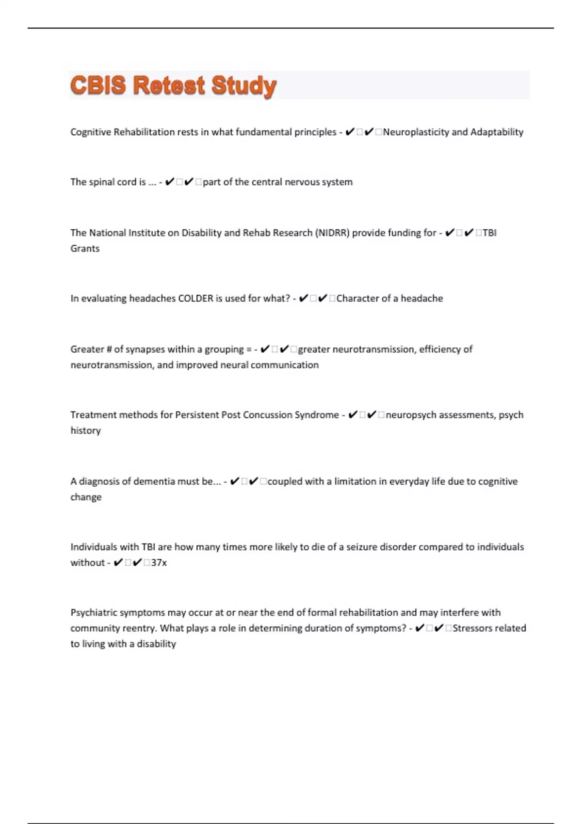Cognitive Rehabilitation rests in what fundamental principles - ️️Neuroplasticity and Adaptability The spinal cord is ... - ️️part of the central nervous system The National Institute on Disability and Rehab Research (NIDRR) provide funding for - ️️TBI Grants In evaluating headaches COLDER is used for what? - ️️Character of a headache Greater # of synapses within a grouping = - ️️greater neurotransmission, efficiency of neurotransmission, and improved neural communication Treatment methods for Persistent Post Concussion Syndrome - ️️neuropsych assessments, psych history A diagnosis of dementia must be... - ️️coupled with a limitation in everyday life due to cognitive change Individuals with TBI are how many times more likely to die of a seizure disorder compared to individuals without - ️️37x Psychiatric symptoms may occur at or near the end of formal rehabilitation and may interfere with community reentry. What plays a role in determining duration of symptoms? - ️️Stressors related to living with a disability