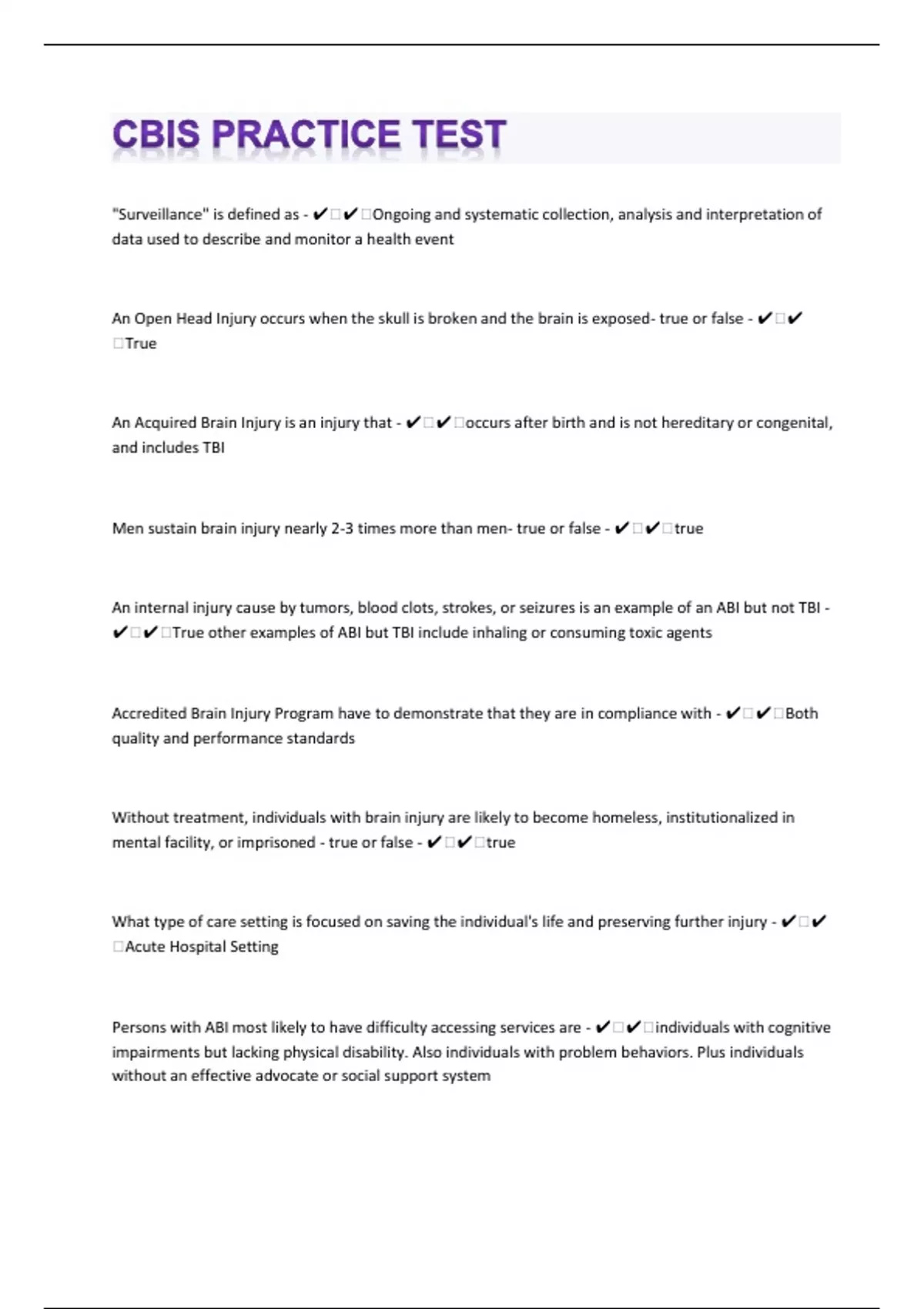 "Surveillance" is defined as - ️️Ongoing and systematic collection, analysis and interpretation of data used to describe and monitor a health event An Open Head Injury occurs when the skull is broken and the brain is exposed- true or false - ️️True An Acquired Brain Injury is an injury that - ️️occurs after birth and is not hereditary or congenital, and includes TBI Men sustain brain injury nearly 2-3 times more than men- true or false - ️️true An internal injury cause by tumors, blood clots, strokes, or seizures is an example of an ABI but not TBI - ️️True other examples of ABI but TBI include inhaling or consuming toxic agents Accredited Brain Injury Program have to demonstrate that they are in compliance with - ️️Both quality and performance standards Without treatment, individuals with brain injury are likely to become homeless, institutionalized in mental facility, or imprisoned - true or false - ️️true What type of care setting is focused on saving the individual's life and preserving further injury - ️️Acute Hospital Setting Persons with ABI most likely to have difficulty accessing services are - ️️individuals with cognitive impairments but lacking physical disability. Also individuals with problem behaviors. Plus individuals without an effective advocate or social support system