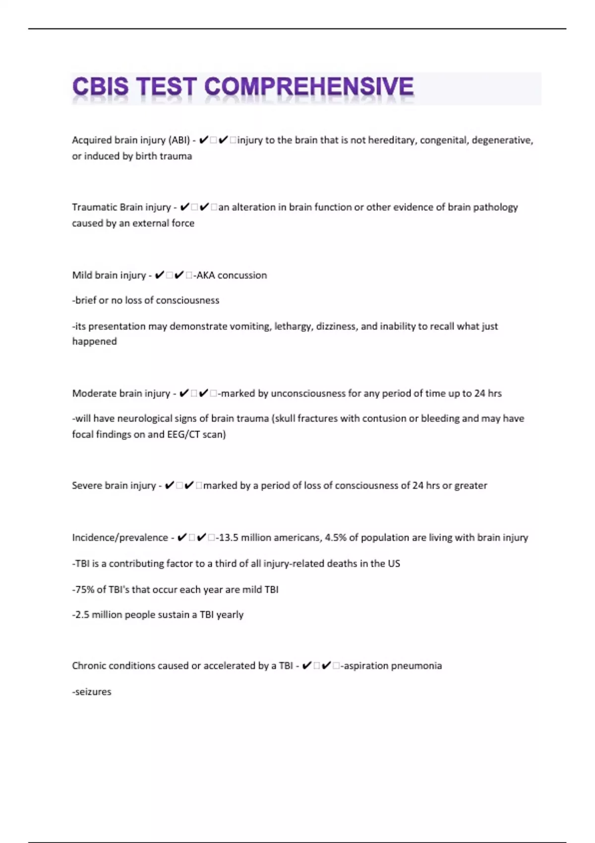 Acquired brain injury (ABI) - ️️injury to the brain that is not hereditary, congenital, degenerative, or induced by birth trauma Traumatic Brain injury - ️️an alteration in brain function or other evidence of brain pathology caused by an external force Mild brain injury - ️️-AKA concussion -brief or no loss of consciousness -its presentation may demonstrate vomiting, lethargy, dizziness, and inability to recall what just happened Moderate brain injury - ️️-marked by unconsciousness for any period of time up to 24 hrs -will have neurological signs of brain trauma (skull fractures with contusion or bleeding and may have focal findings on and EEG/CT scan) Severe brain injury - ️️marked by a period of loss of consciousness of 24 hrs or greater Incidence/prevalence - ️️-13.5 million americans, 4.5% of population are living with brain injury -TBI is a contributing factor to a third of all injury-related deaths in the US -75% of TBI's that occur each year are mild TBI -2.5 million people sustain a TBI yearly Chronic conditions caused or accelerated by a TBI - ️️-aspiration pneumonia -seizures