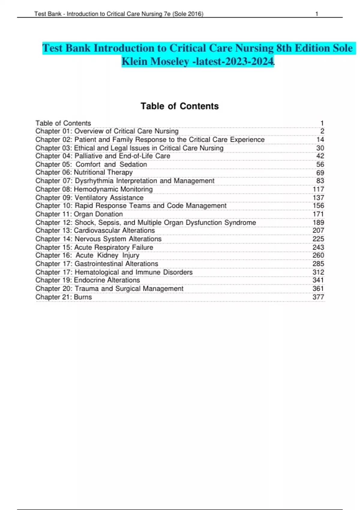 COMPLETE A+ TEST BANK Introduction to Critical Care Nursing 8th Edition By Sole Klein Moseley Test Bank/All Chapters Included/ ISBN-/ Instant Download