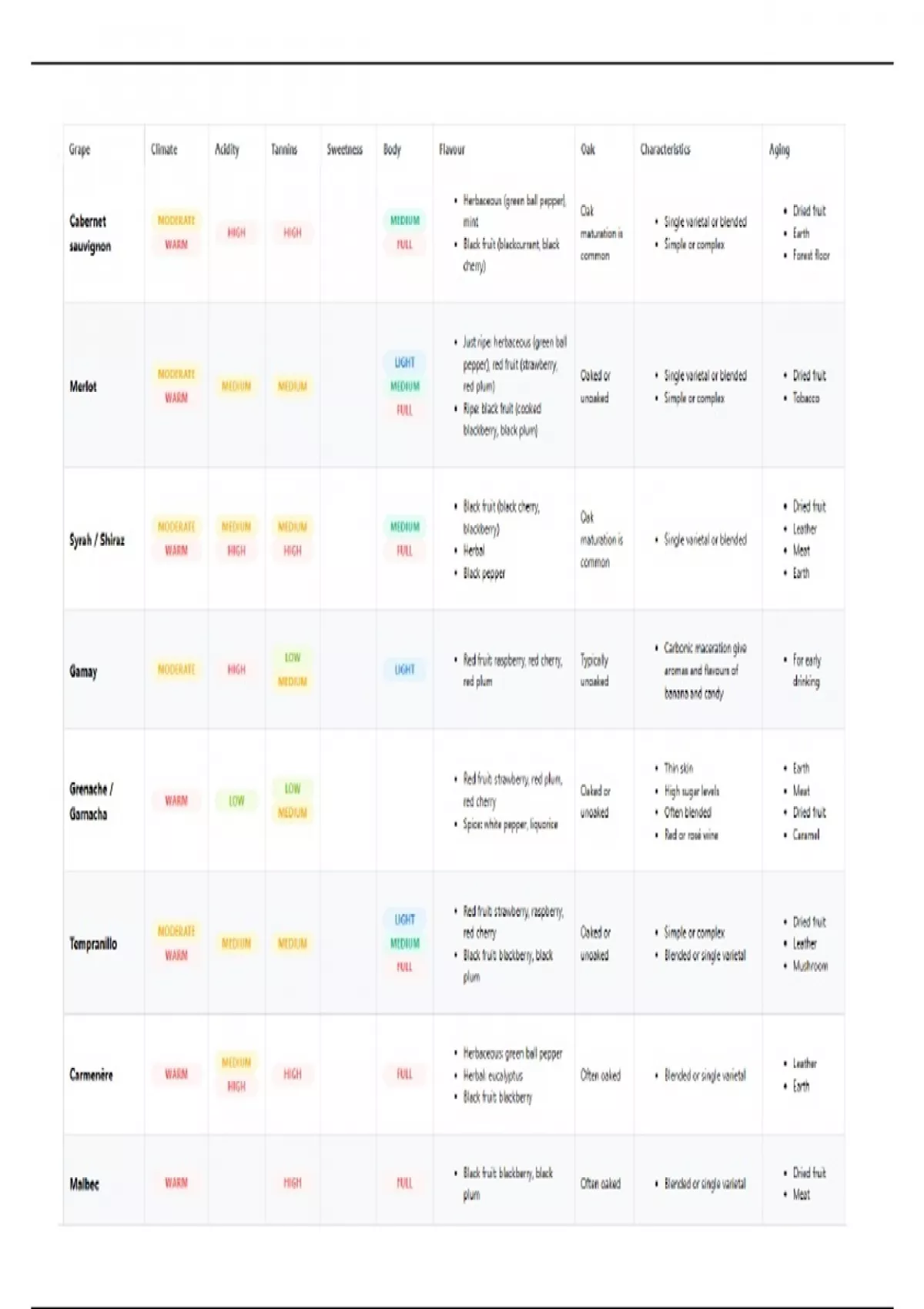 Extensive tables with detailed grape variety descriptions as used in the WSET 2 study book. Distinction between characteristics and regional presence.
