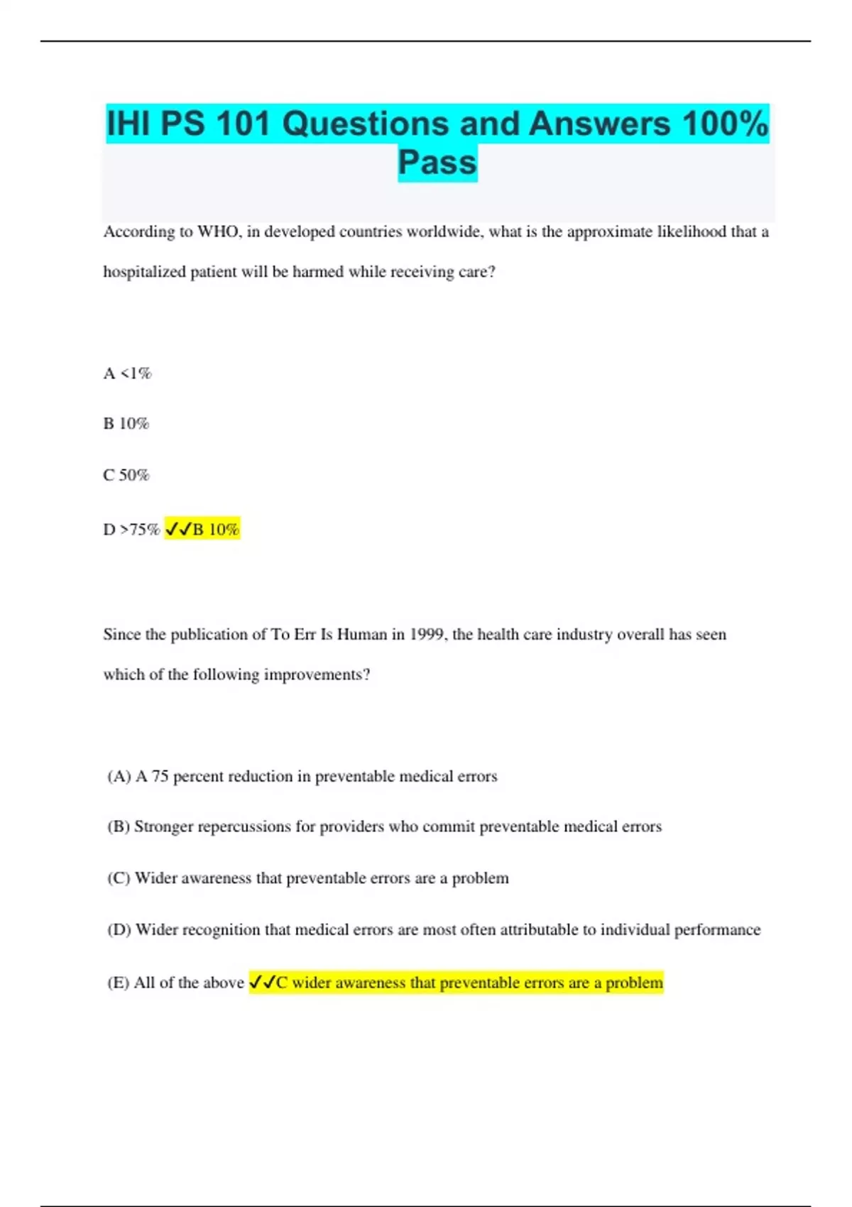 According to WHO, in developed countries worldwide, what is the approximate likelihood that a hospitalized patient will be harmed while receiving care? A <1% B 10% C 50% D >75% B 10% Since the publication of To Err Is Human in 1999, the health care industry overall has seen which of the following improvements?
