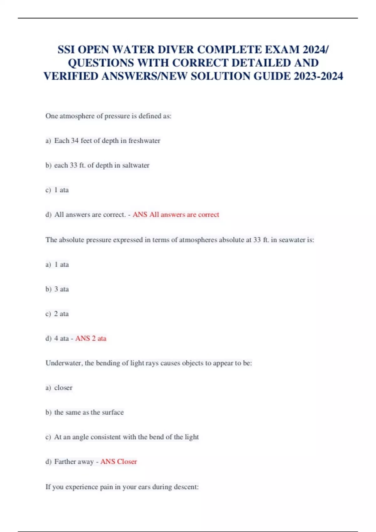 SSI OPEN WATER DIVER COMPLETE EXAM 2024/ QUESTIONS WITH CORRECT DETAILED AND VERIFIED ANSWERS/NEW SOLUTION GUIDE