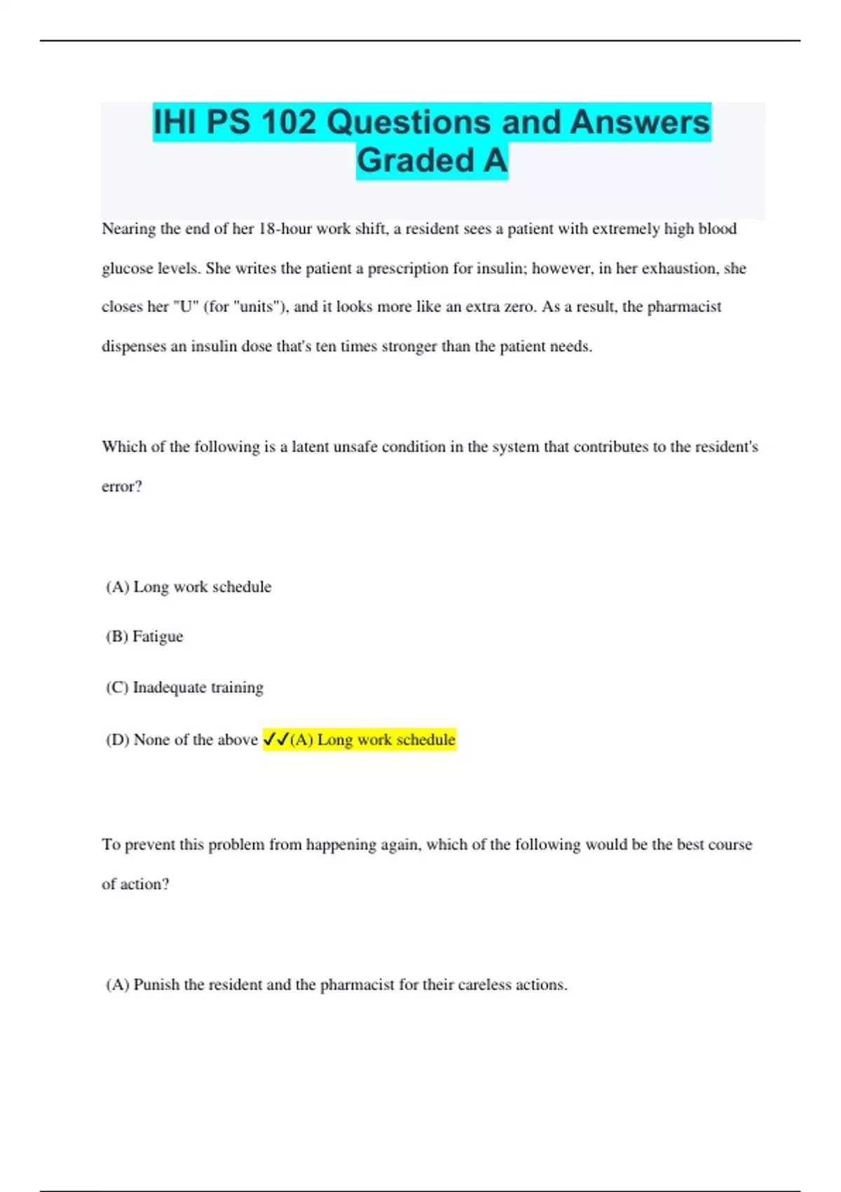 Nearing the end of her 18-hour work shift, a resident sees a patient with extremely high blood glucose levels. She writes the patient a prescription for insulin; however, in her exhaustion, she closes her "U" (for "units"), and it looks more like an extra zero. As a result, the pharmacist dispenses an insulin dose that's ten times stronger than the patient needs. Which of the following is a latent unsafe condition in the system that contributes to the resident's error? (A) Long work schedule (B) Fatigue (C) Inadequate training (D) None of the above (A) Long work schedule