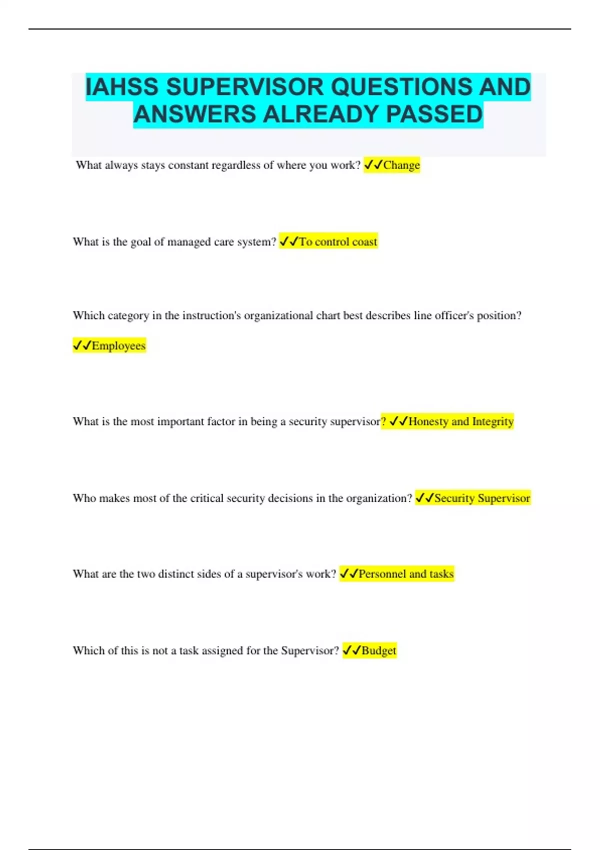 IAHSS SUPERVISOR QUESTIONS AND ANSWERS ALREADY PASSED